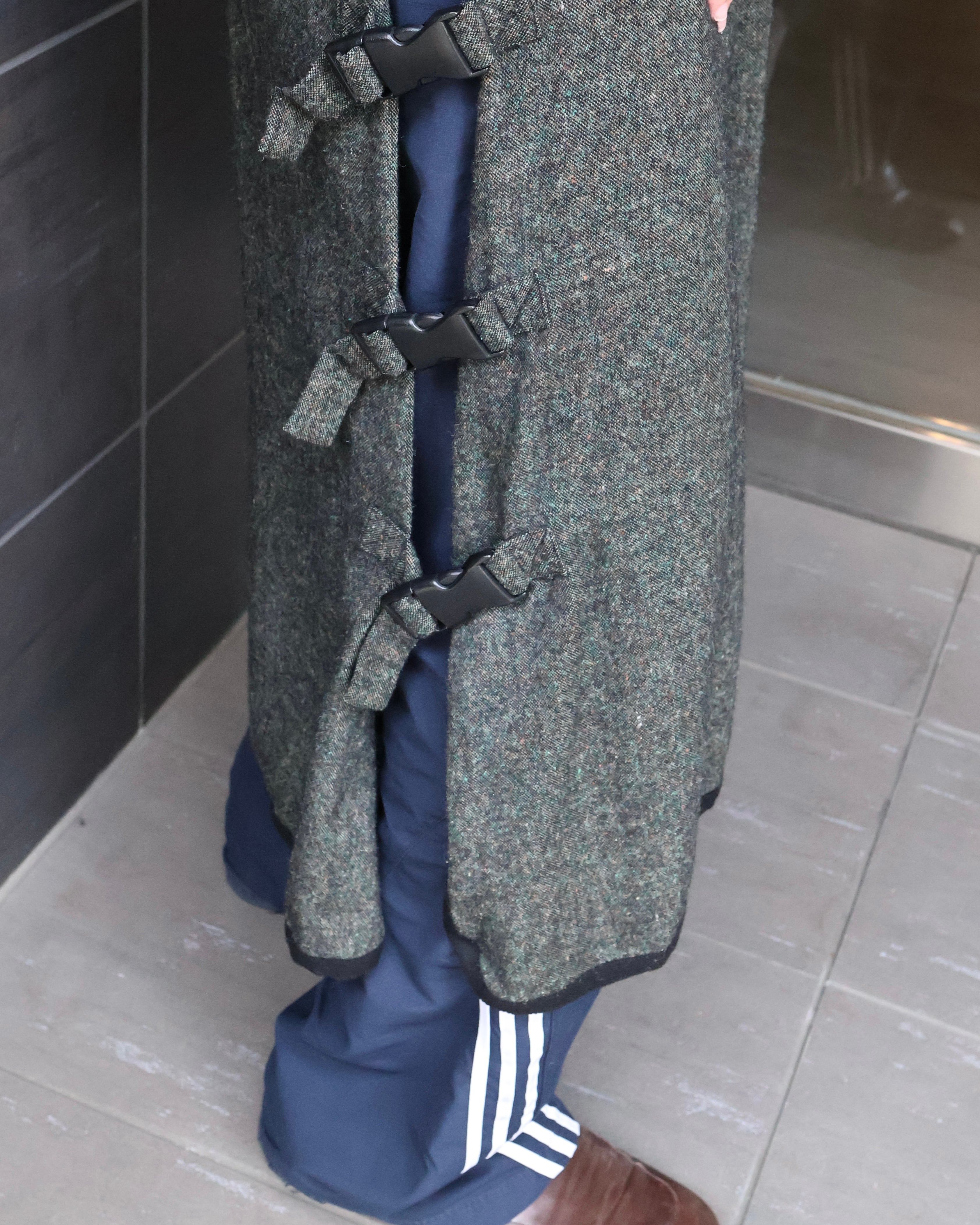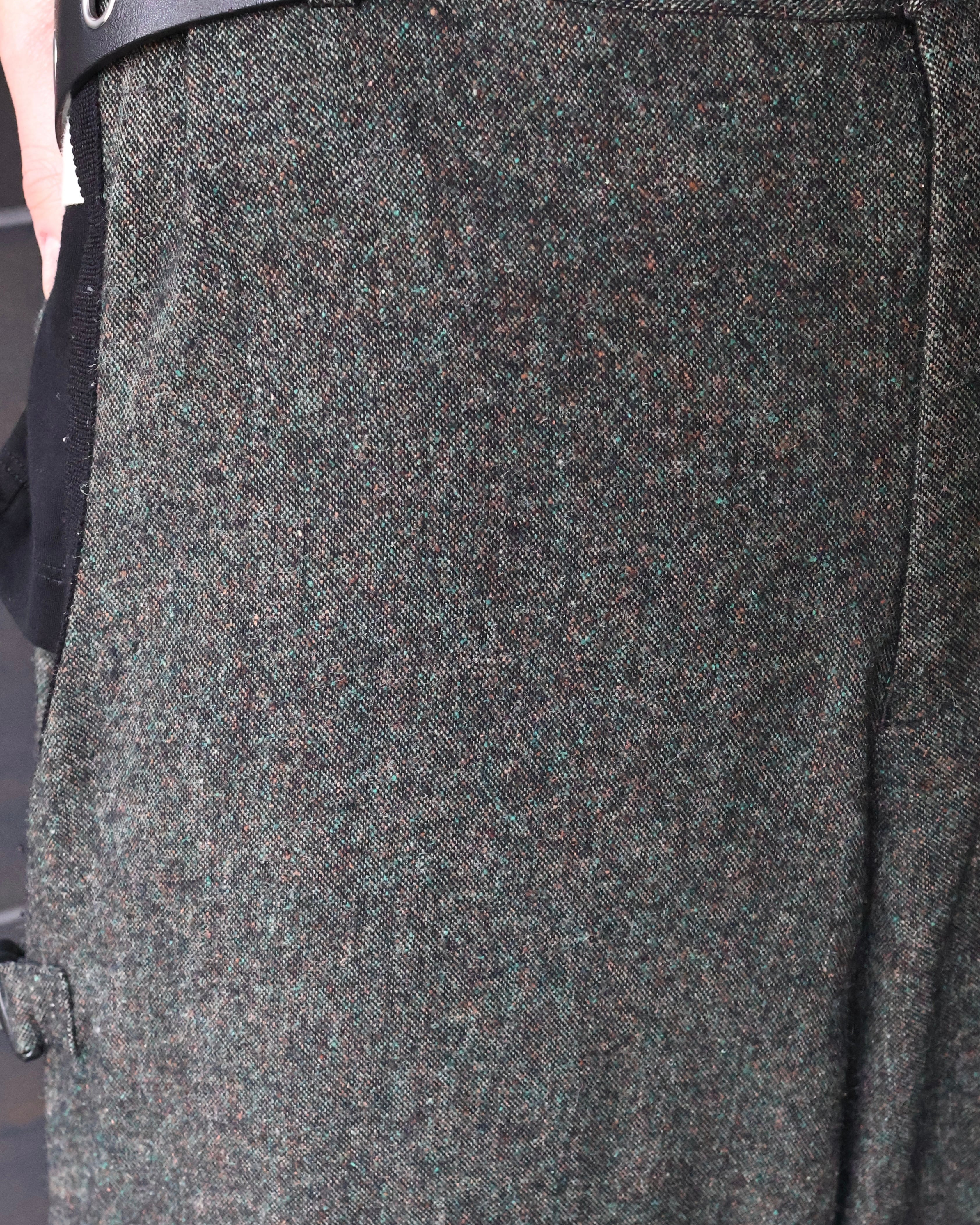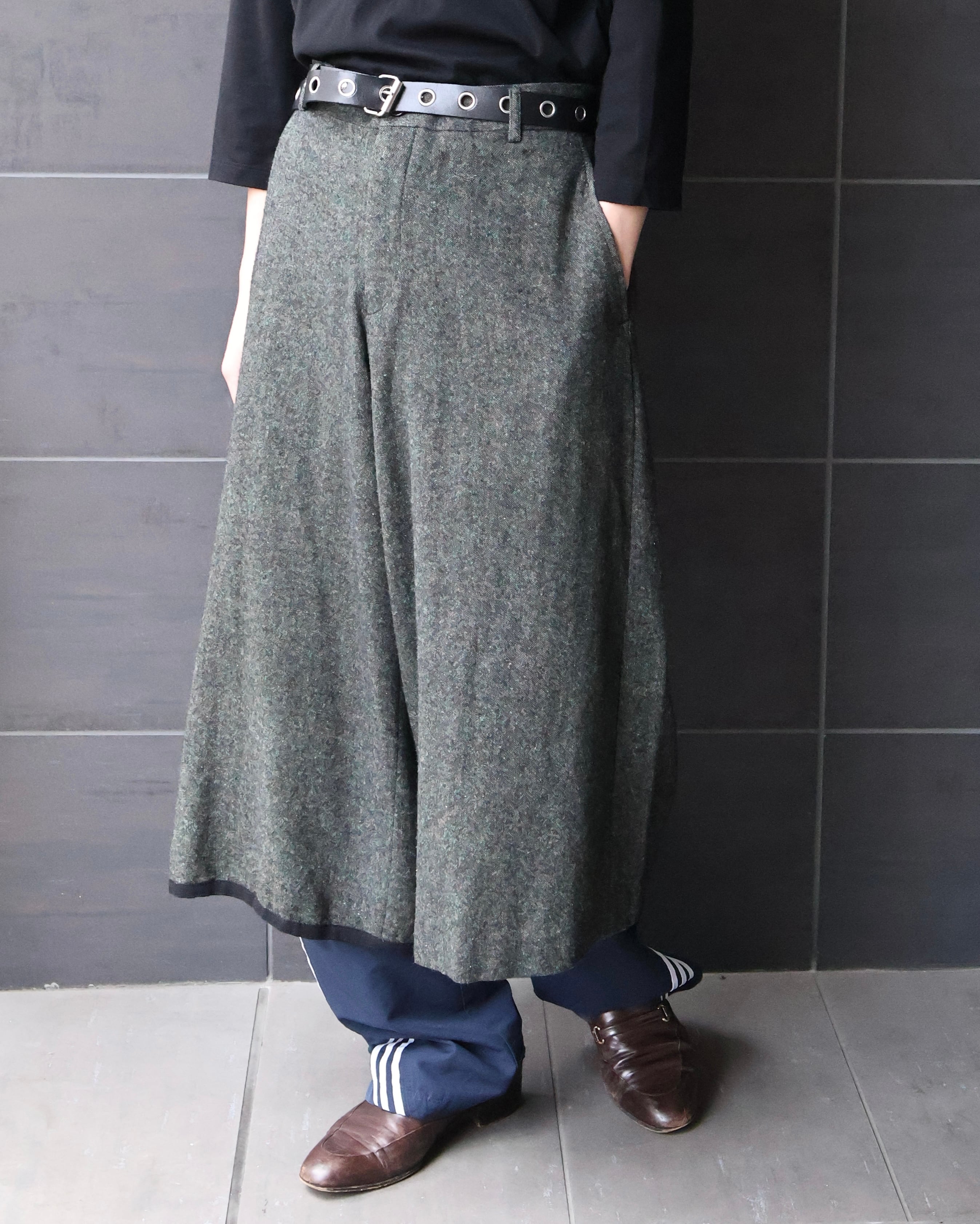 ベースは重厚感のあるウールライクなファブリック。まず目を引くのが、サイドに配されたバックルディテール。機能性を感じさせつつ、デザインとしてしっかり主張することで、ただの巻きスカートやレイヤードパーツに留まらない存在感を確立しており、上質なモードを演出できるようなアイテム。このファブリックでのデザインだからこその、チープな仕上がりではないビジュアルの担保になっている、ブランドならではのパンツ。