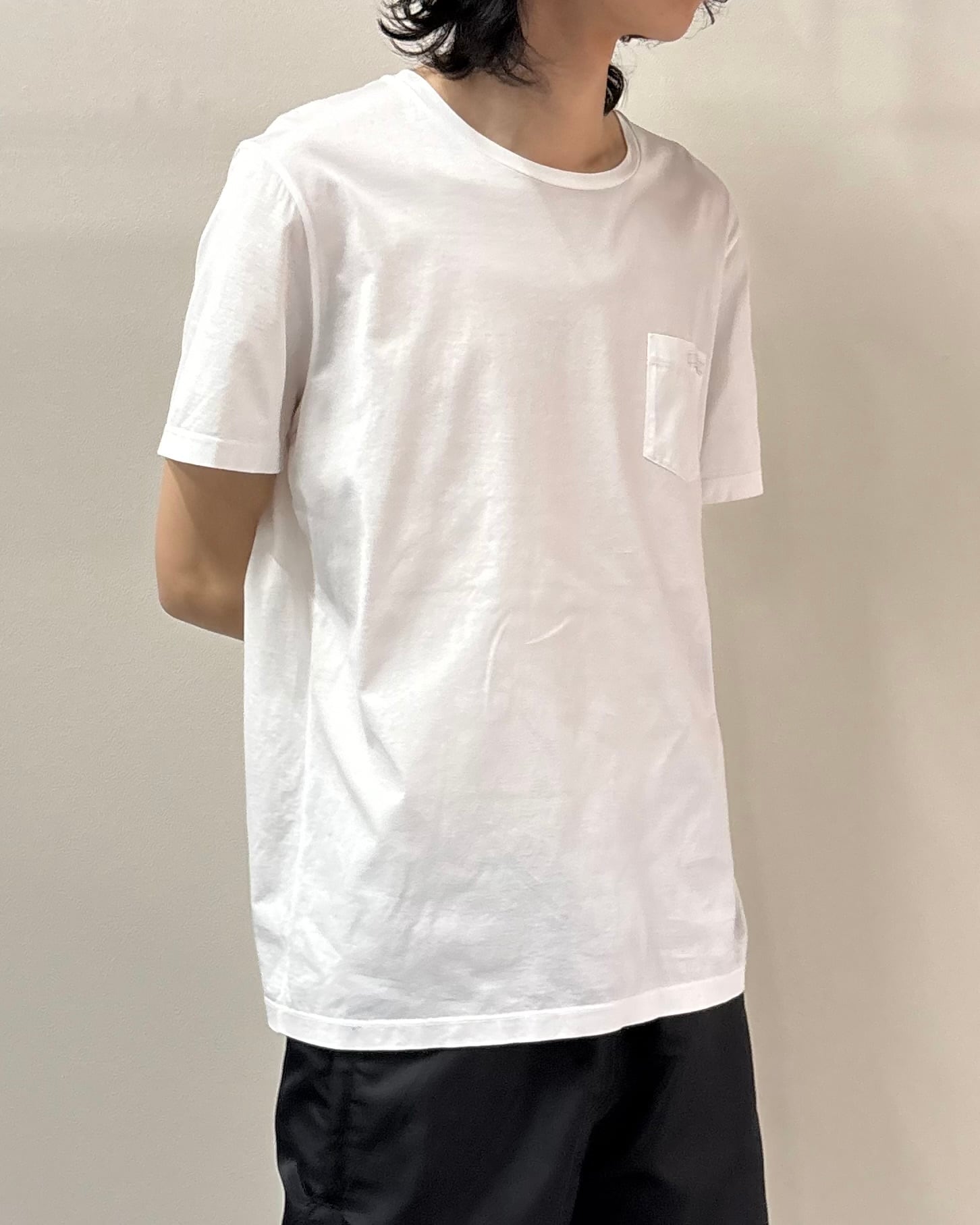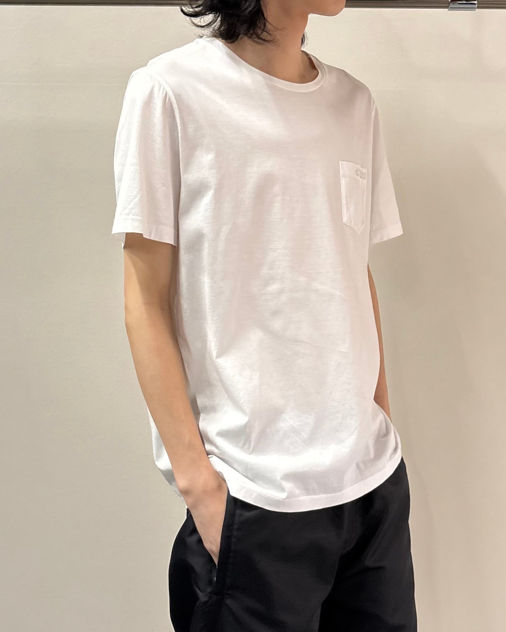 上質なコットン素材を使用し、柔らかさと程よいハリ感を兼ね備えた一着。ベーシックなクルーネックに、胸元のパッチポケットがさりげないアクセント。一枚でもインナーとしても活躍するアイテム。