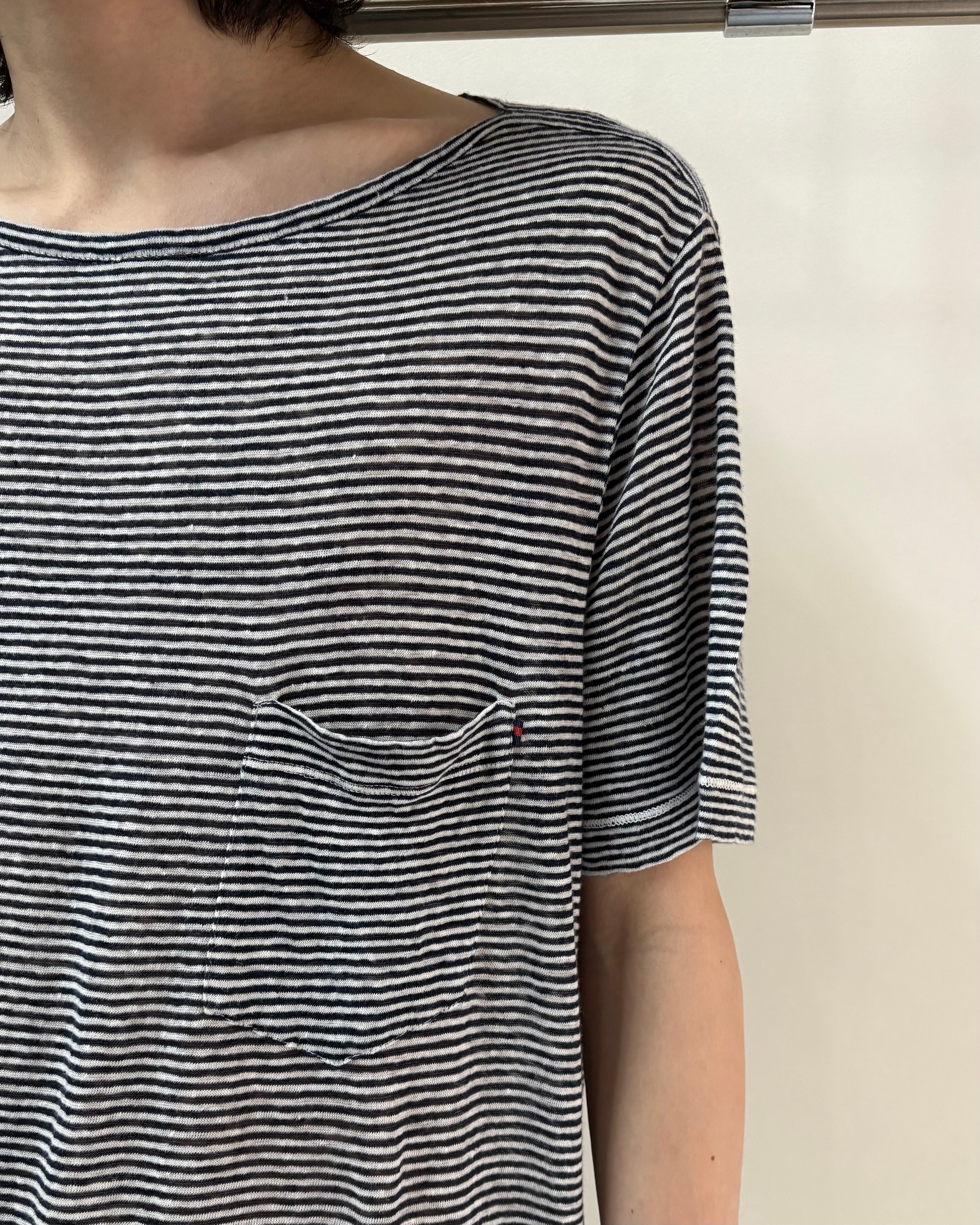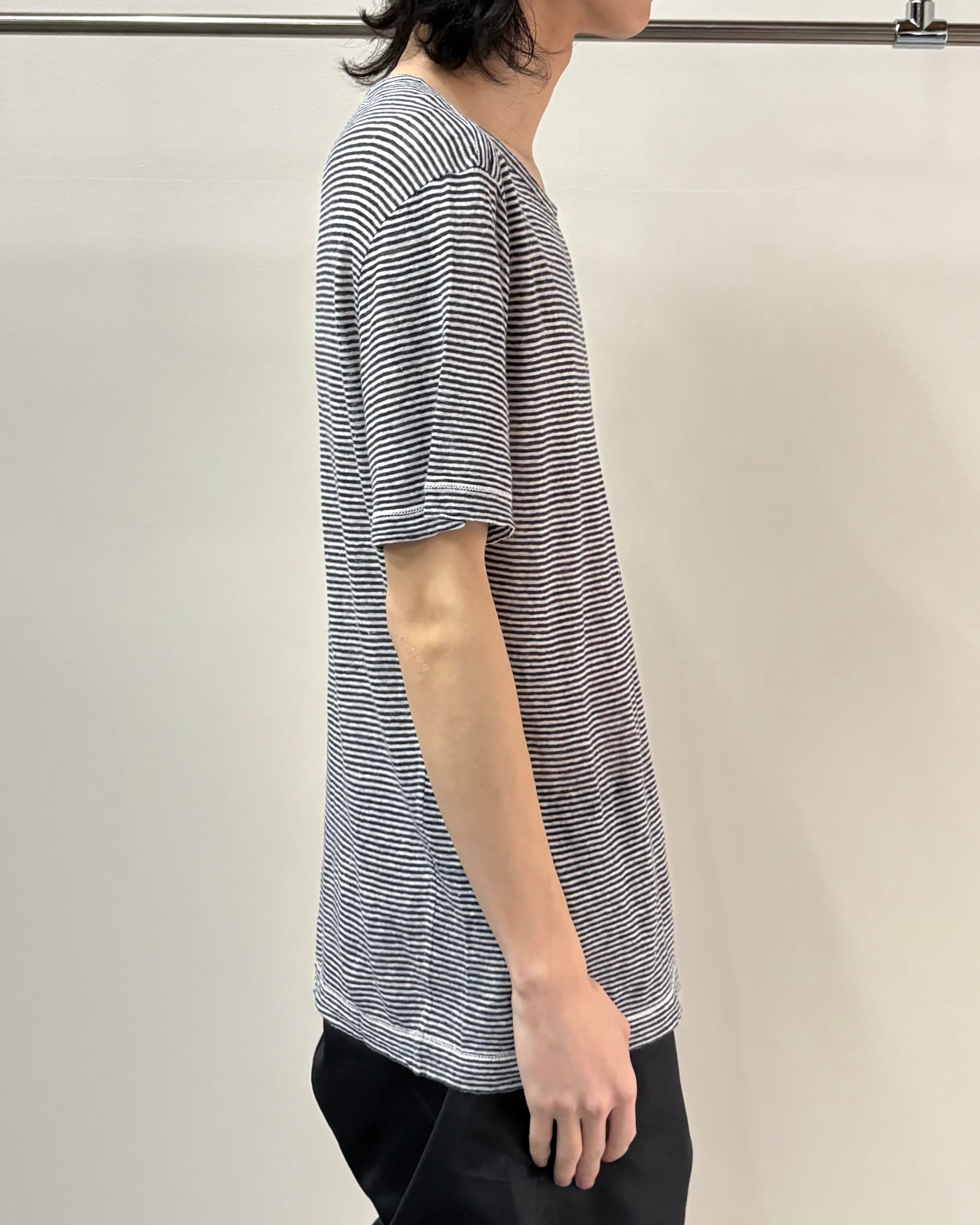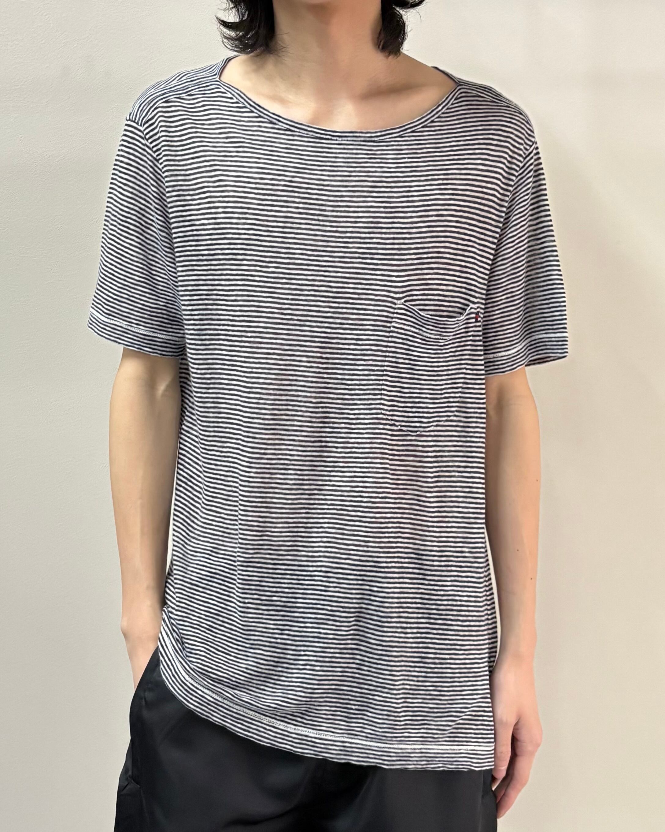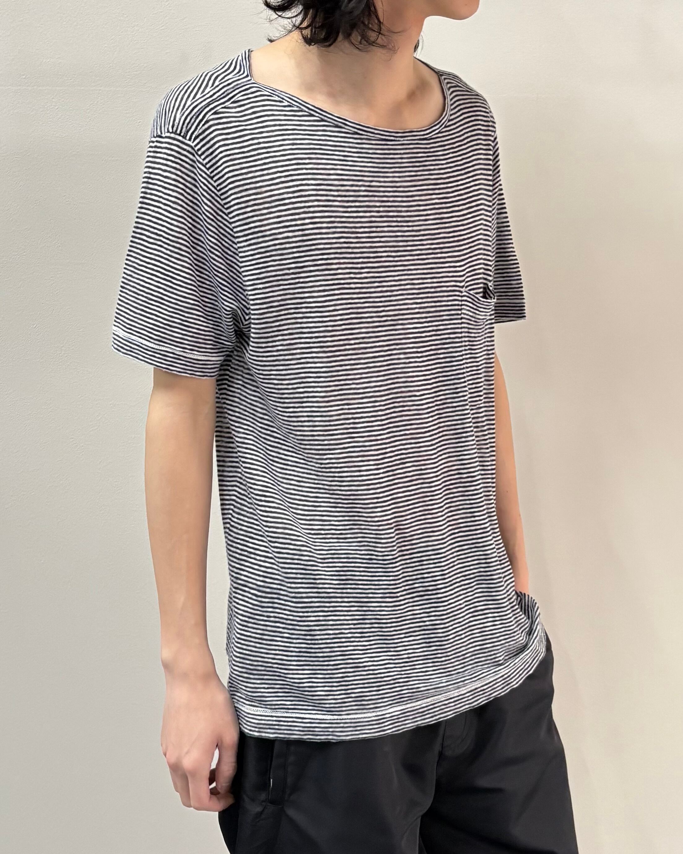 リネン素材を使用したやや透け感のある生地感が特徴のボートネックTシャツ。細かなボーダー柄が程よいアクセントとなり、シンプルながらもスタイリングに表情を加えてくれる一着。一枚での着用はもちろん、ジャケットやシャツのインナーとしても活躍する汎用性の高いアイテム。