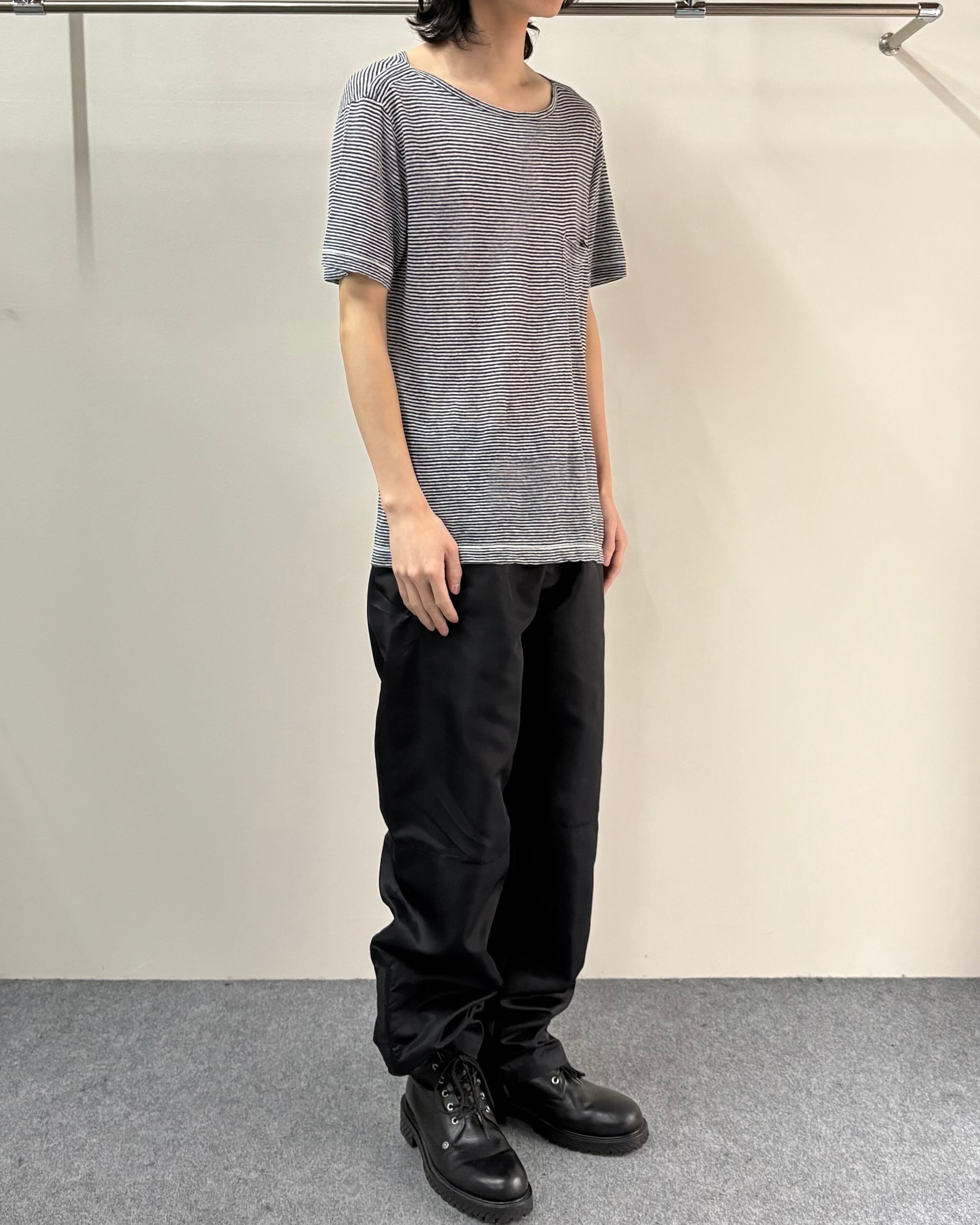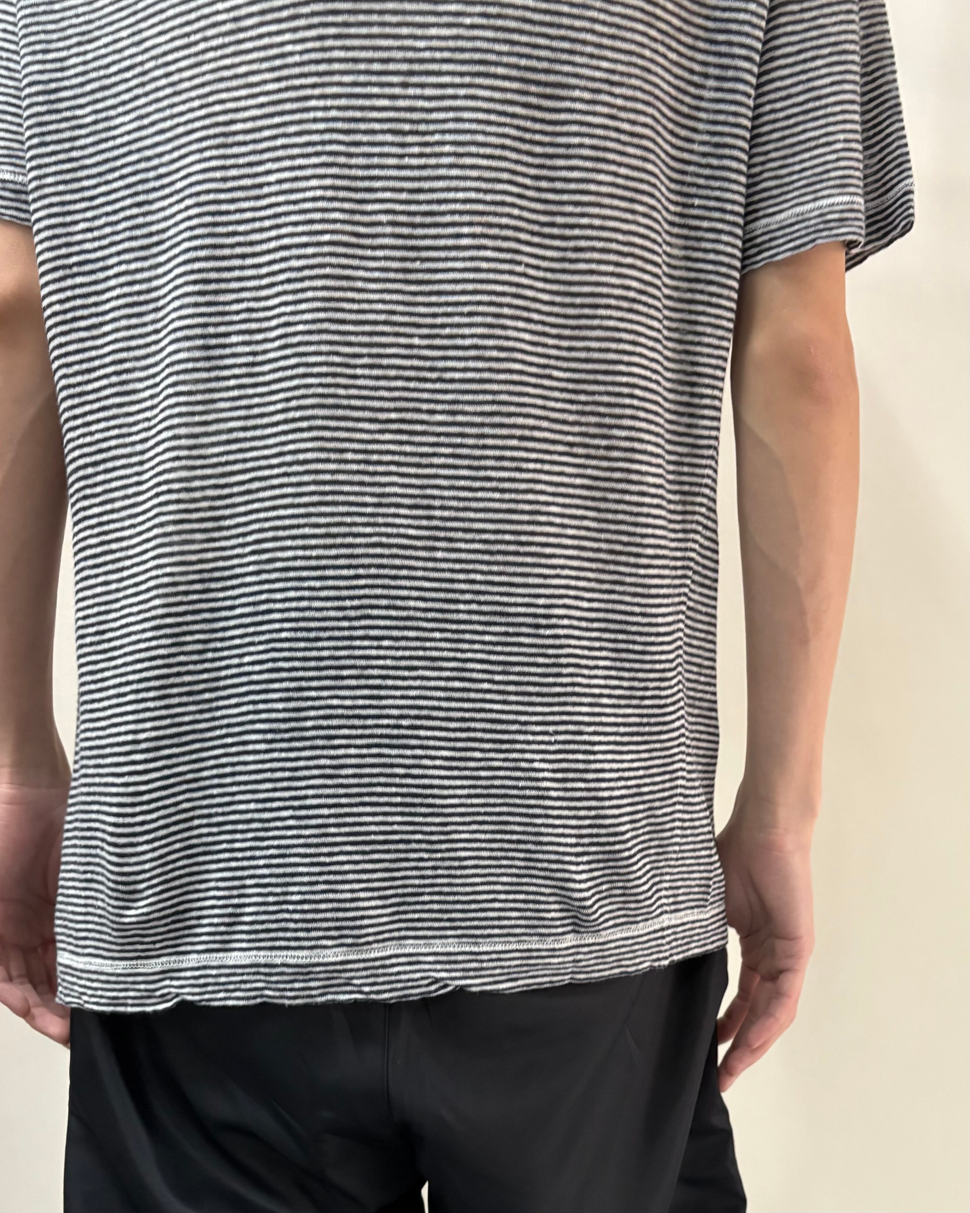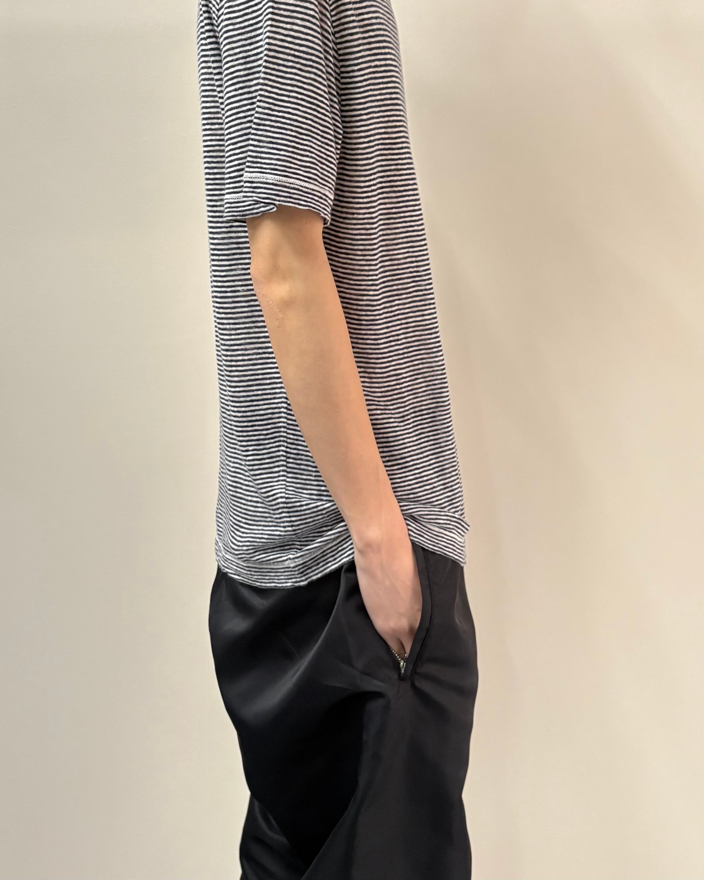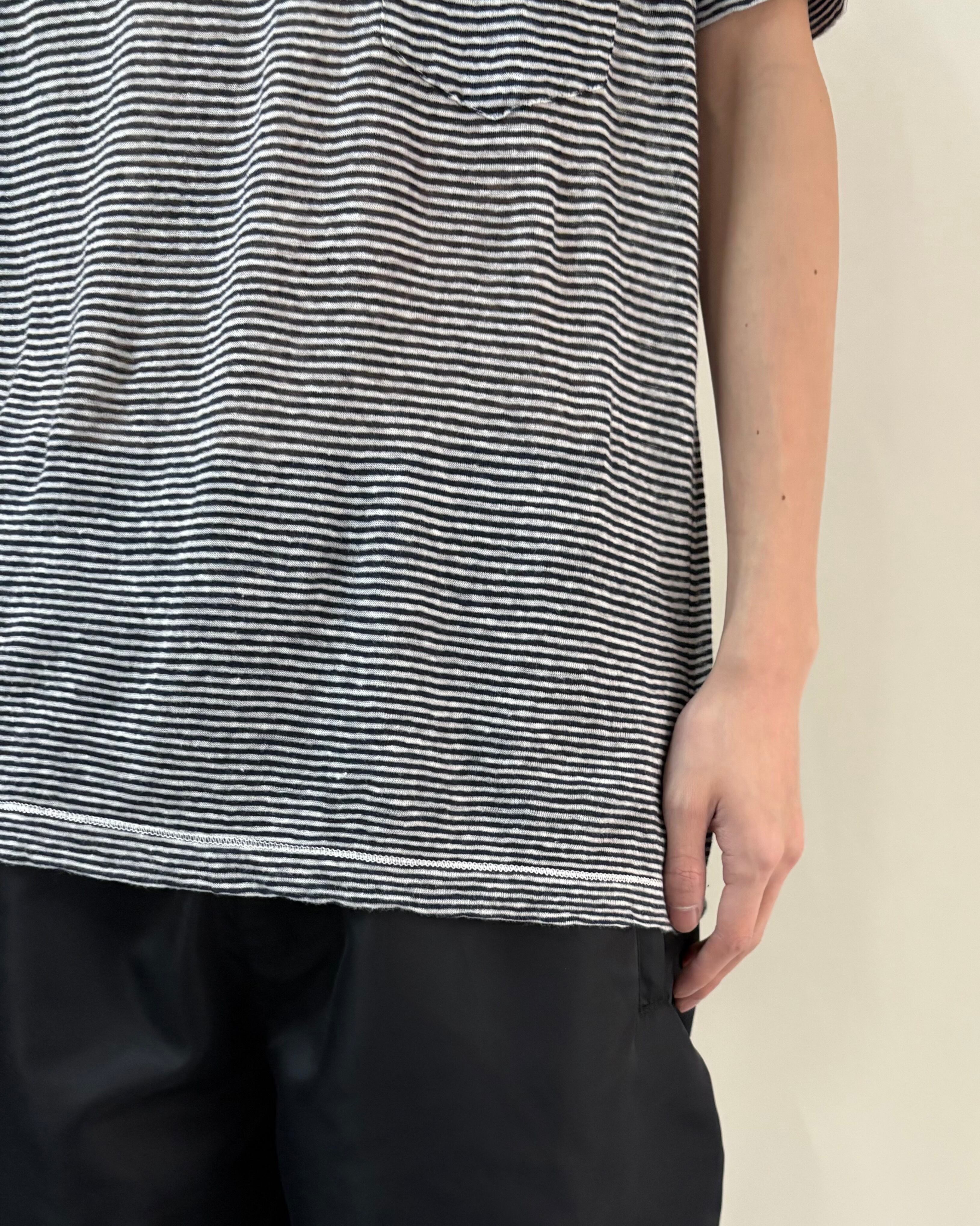リネン素材を使用したやや透け感のある生地感が特徴のボートネックTシャツ。細かなボーダー柄が程よいアクセントとなり、シンプルながらもスタイリングに表情を加えてくれる一着。一枚での着用はもちろん、ジャケットやシャツのインナーとしても活躍する汎用性の高いアイテム。
