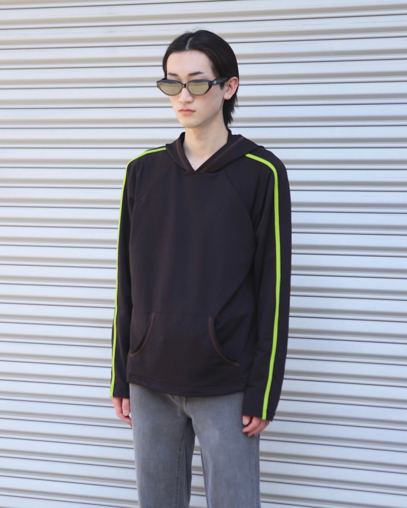 艶感のある生地と肩にかけて蛍光のラインが特徴的なブラウンフーディー。着丈と袖丈のバランス、インナーにも仕込める薄手の素材感、スタイリングの中で活躍できる1着。