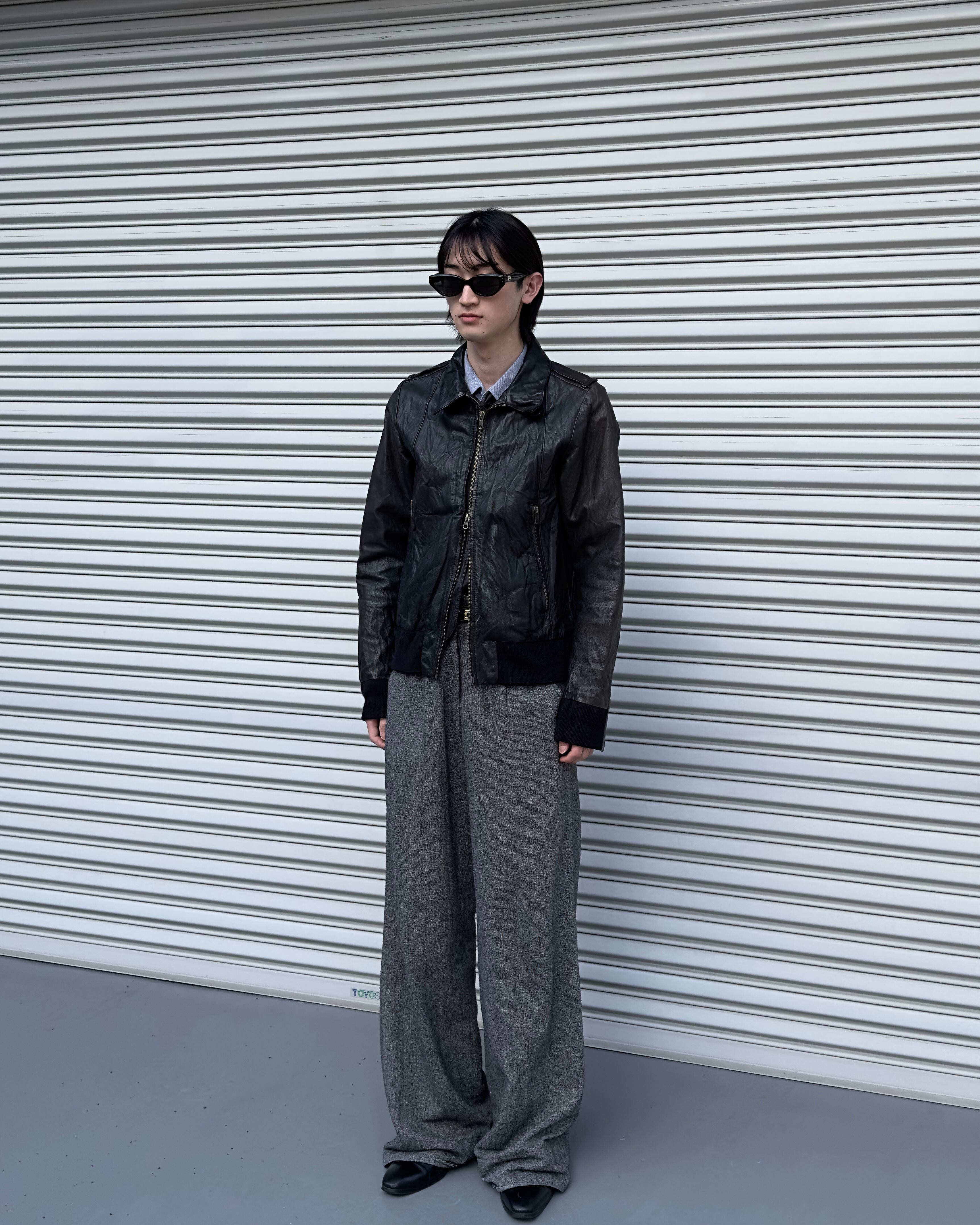 シワ加工の施されたダブルジップレザーブルゾン。