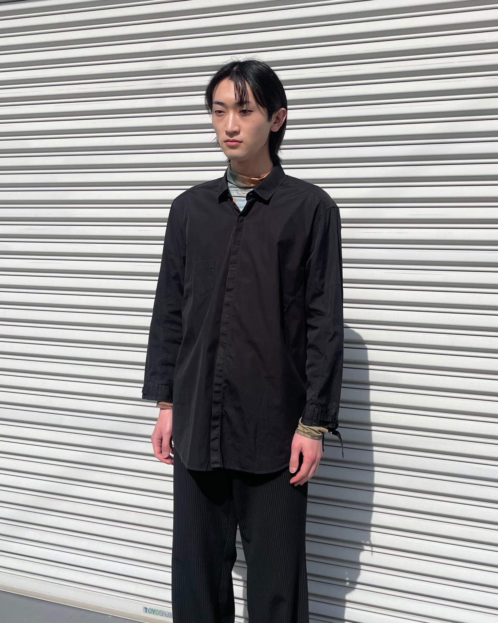 シンプルなデザインに袖のギミックが効いたシャツ。通年使えるシャツでどんなスタイリングにとハマる万能な1着。