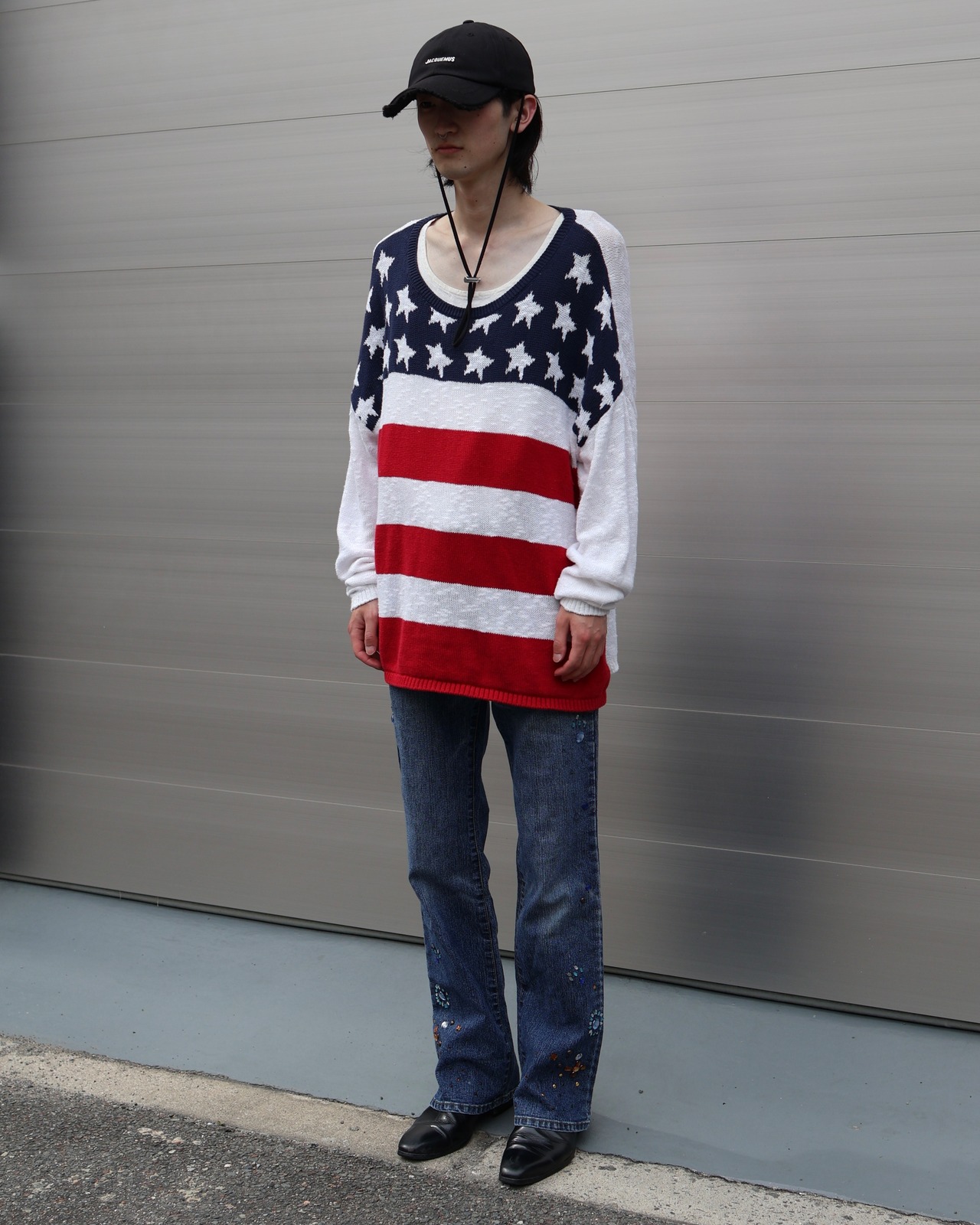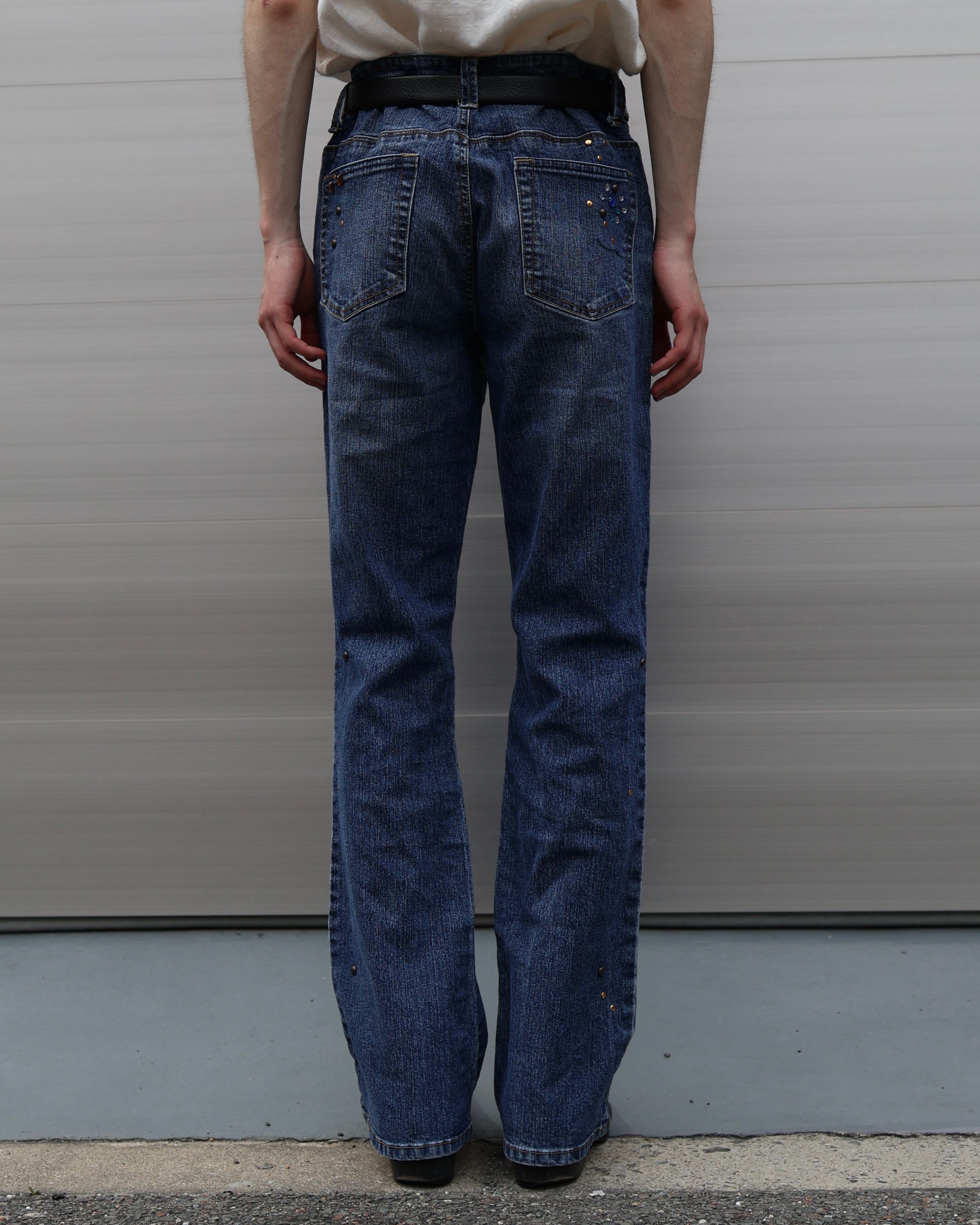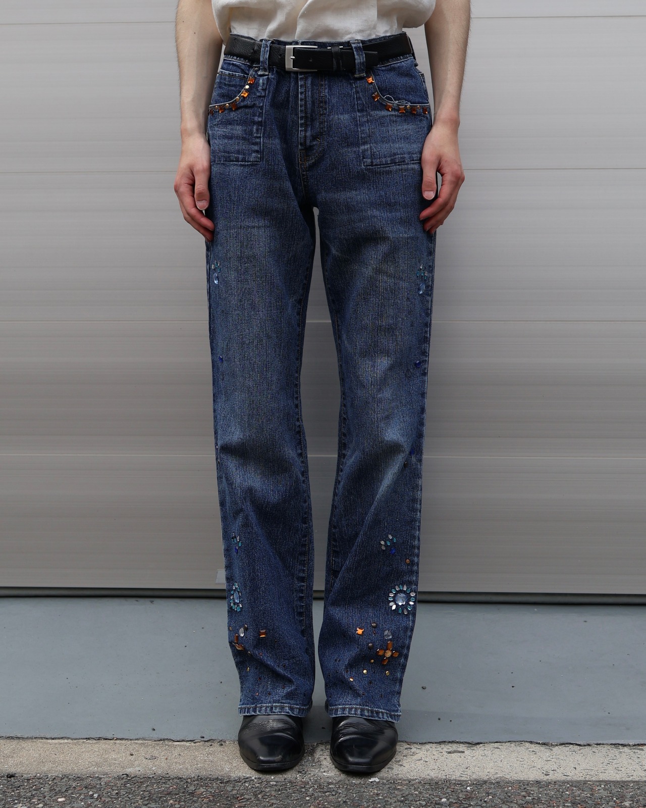 ライトストーンが散りばめらるたストリートデニム。下半身にデザインを持ってこれる1着。