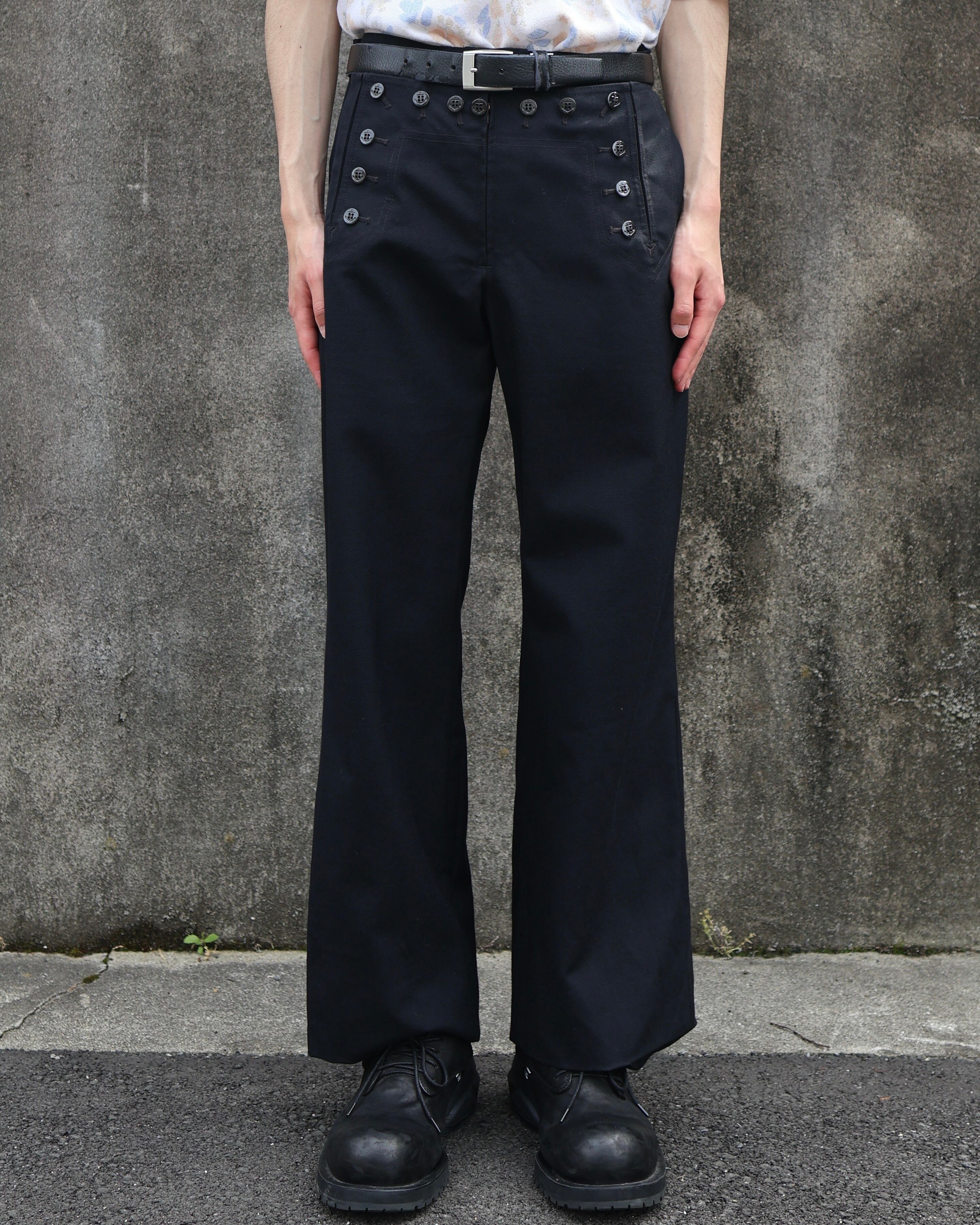 セーラーパンツ特有のフロントボタンが特徴的で、タックインコーデやショート丈アイテムとの相性が良い1着。