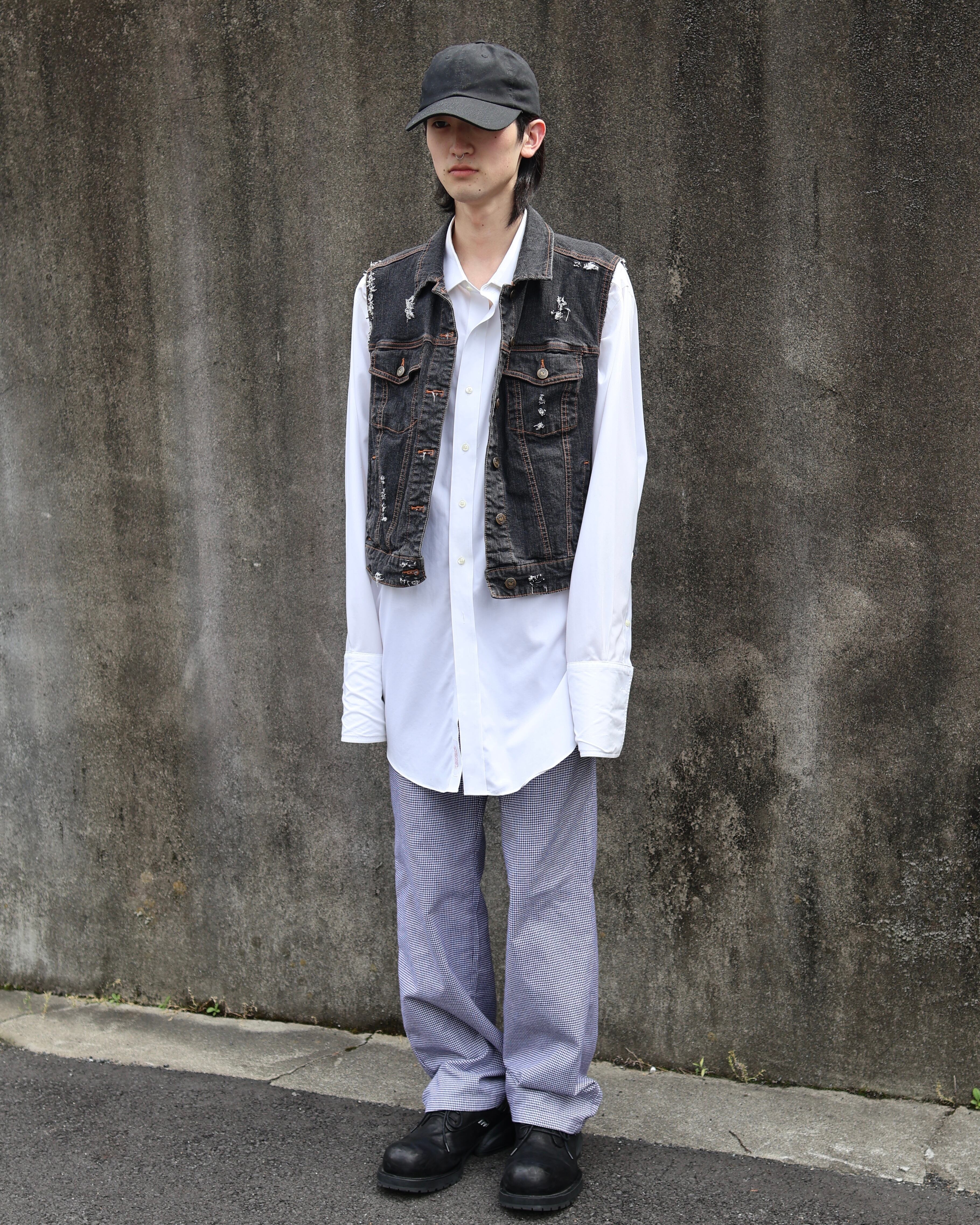 所々にダメージ加工が施されたデニムベスト。