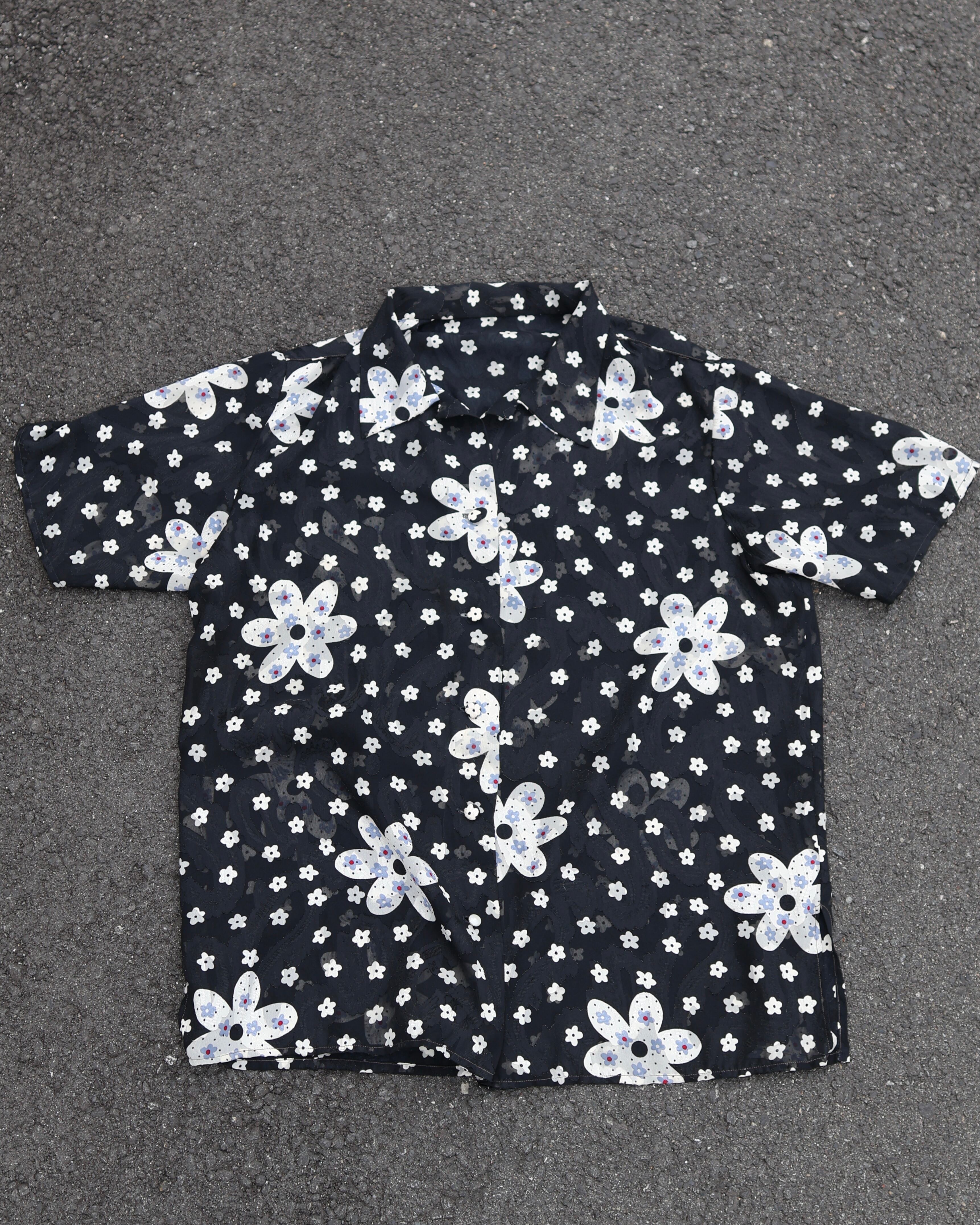 ジャガード織りの生地に花柄のプリントが施されている半袖シャツ