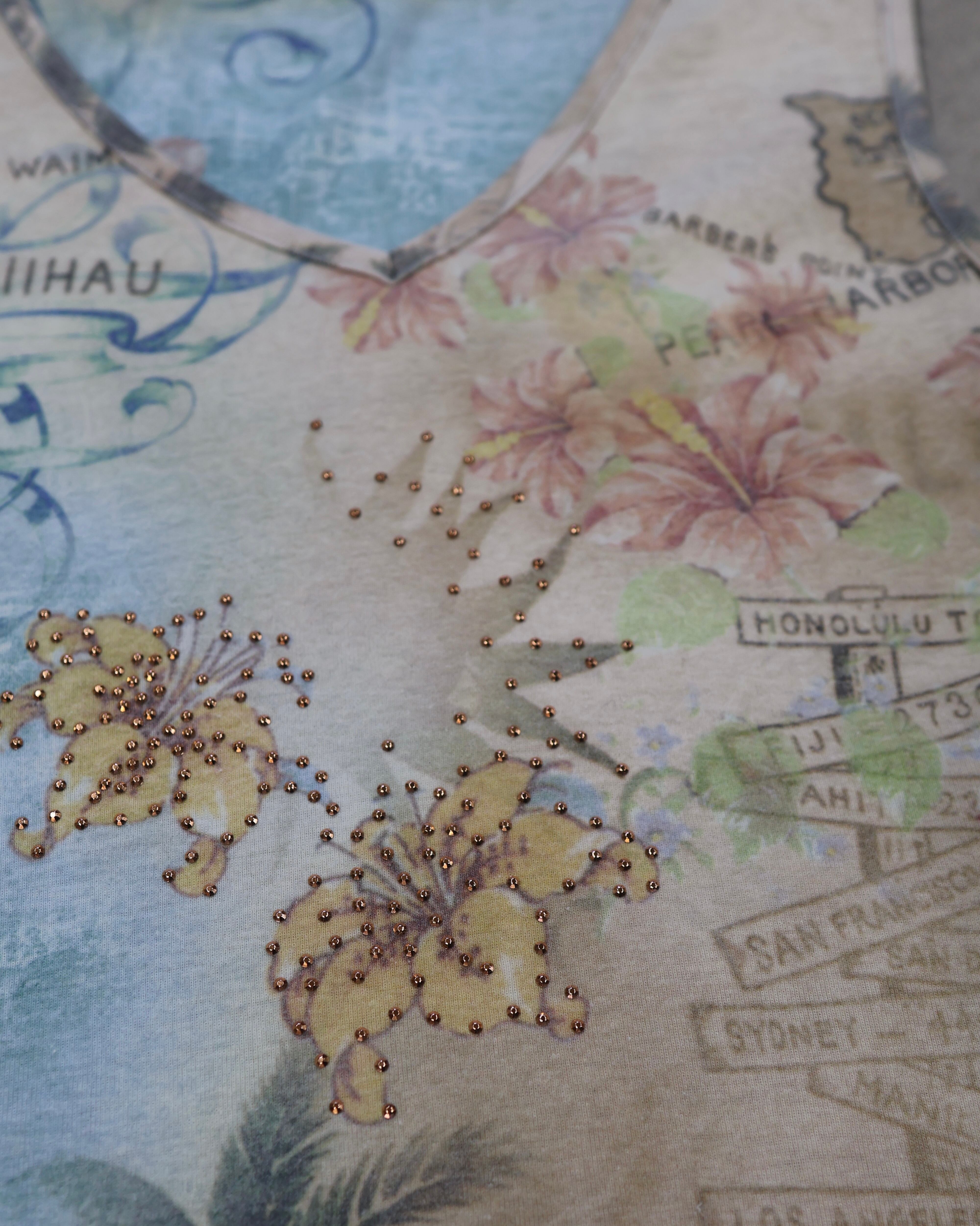 フロント部分の花の輪郭にラインストーンが施されており、1枚でも、インナー要因としても幅広く活躍できる1着。