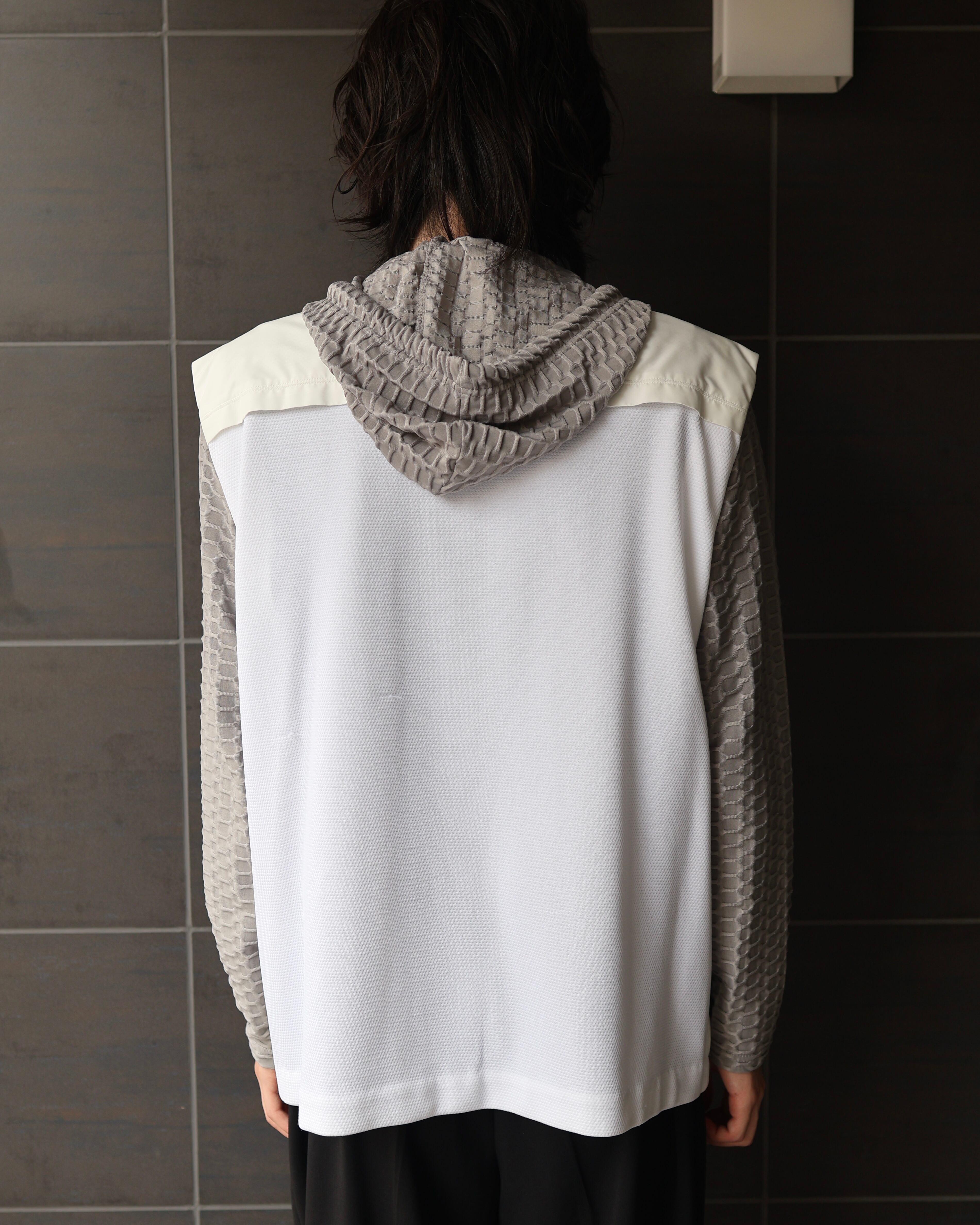 フロント部分に生地の切り返しが施されているのが特徴のベスト。オーバーサイズで秋、冬にレイヤードとして活躍する1着