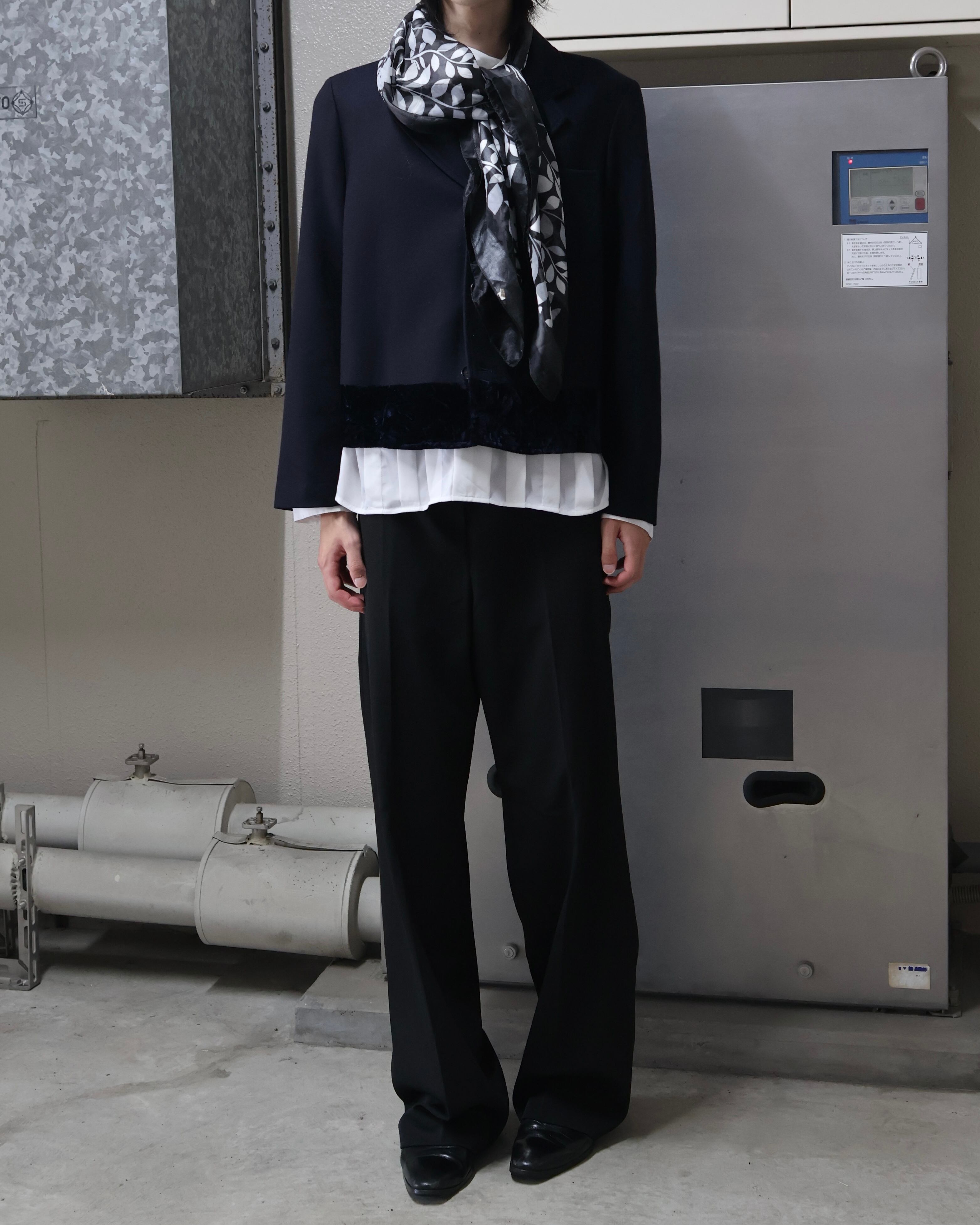 同色ベロアの切り替えが特徴的な短丈のウールジャケット。モードテイストから様々なテイストで主役になってくれる1着。ワイドパンツと合わせてAラインシルエットスタイリングなどがオススメ。