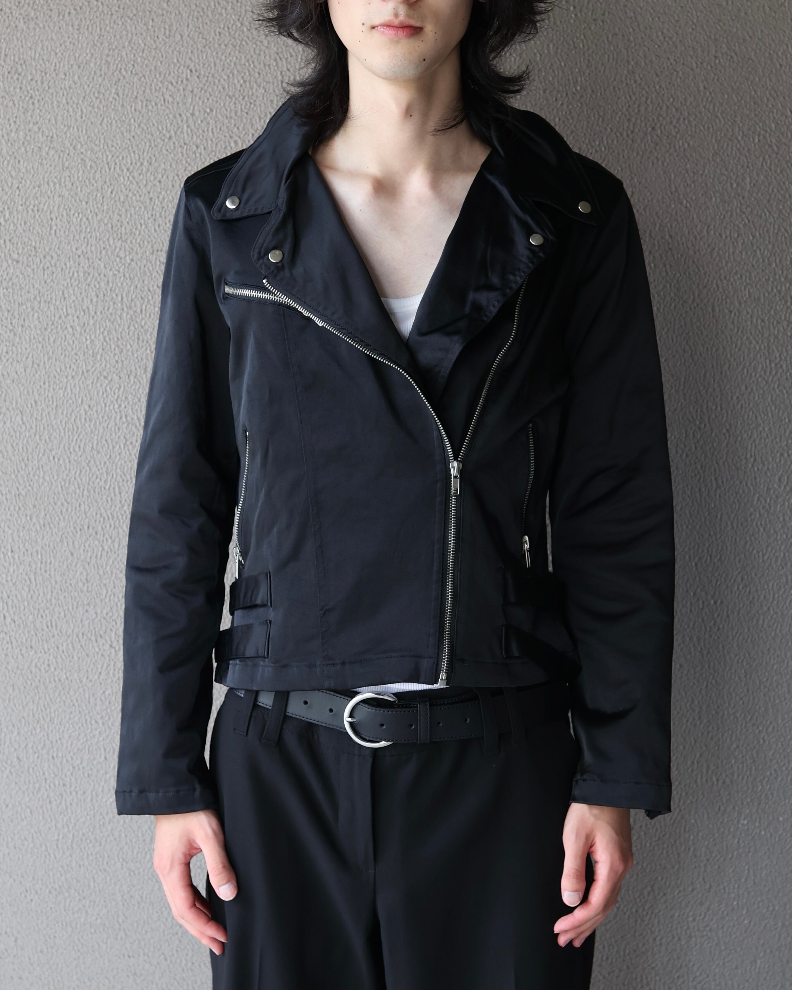 短丈かつアシンメトリーなジップ、襟のスタッズなど、凝ったディテールをしている1着。