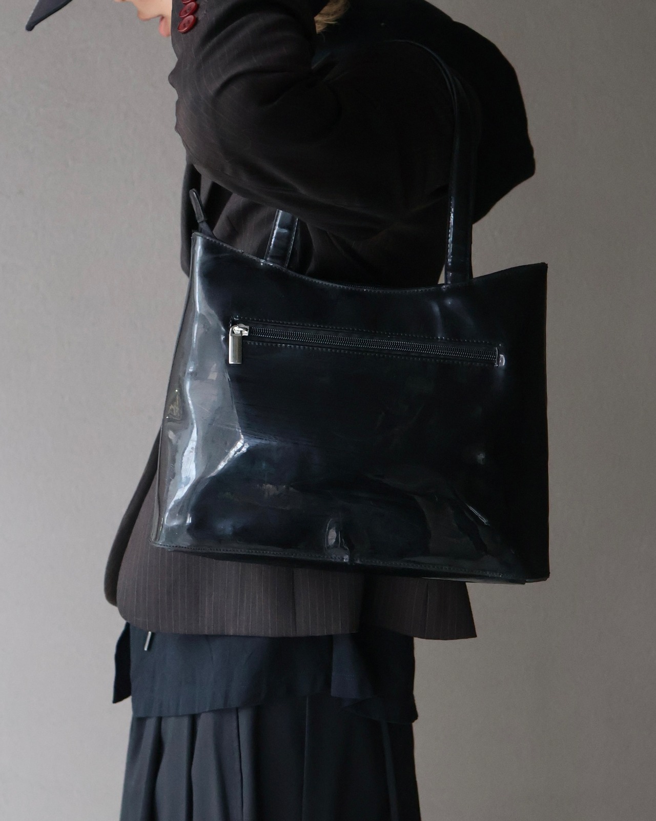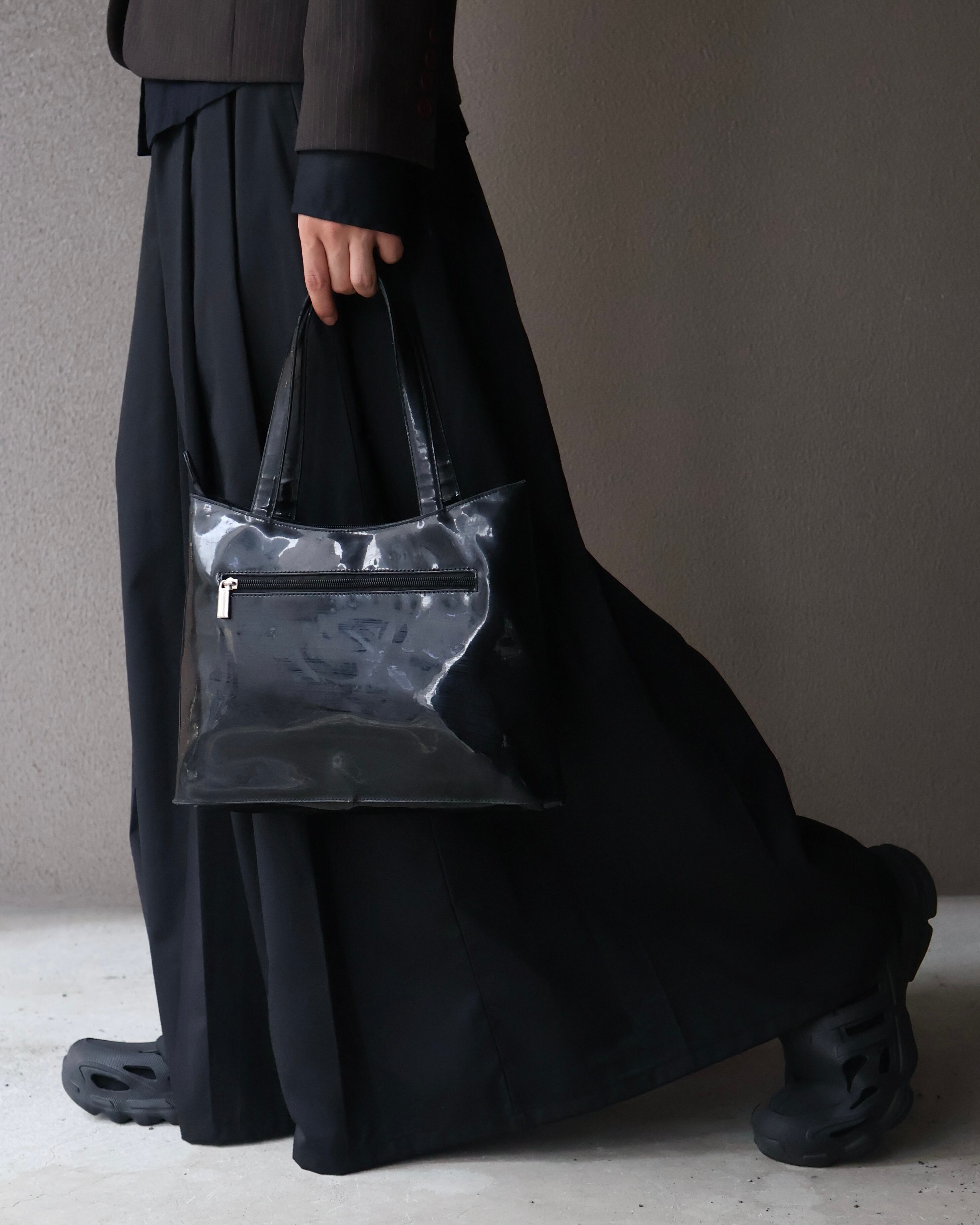 素材が特殊なためモードなスタイリングやラグジュアリーなど幅広いスタイリングに活躍するアイテム。肩掛けから手持ちまでできるサイズ感◎