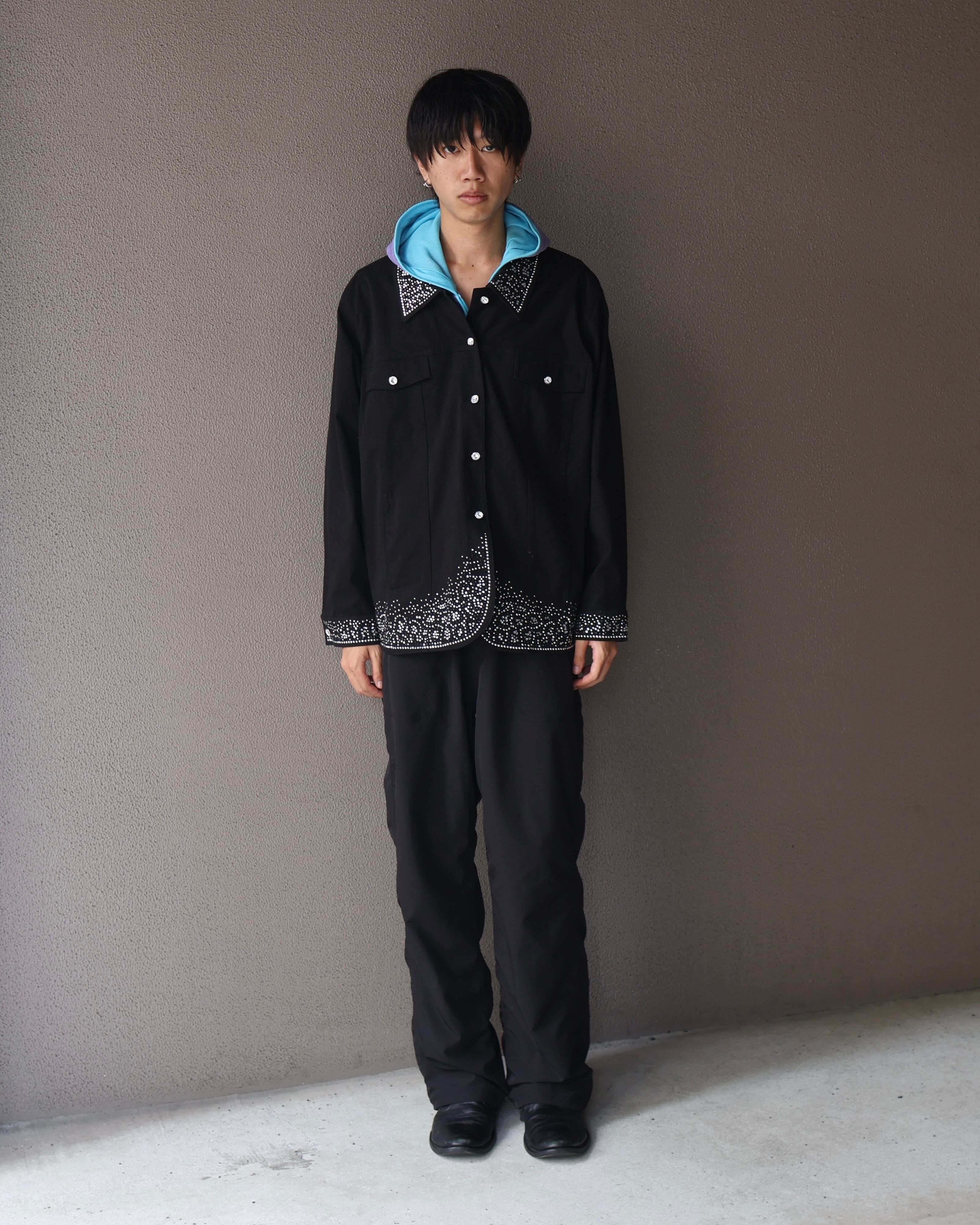 ラインストーンによるデザイン性が高いカバーオール。ゆったりとしたサイズ感で着る人を選ばず一枚で決まるアイテム。デザインが効いたジャケットを持ってない方にはよりおすすめ