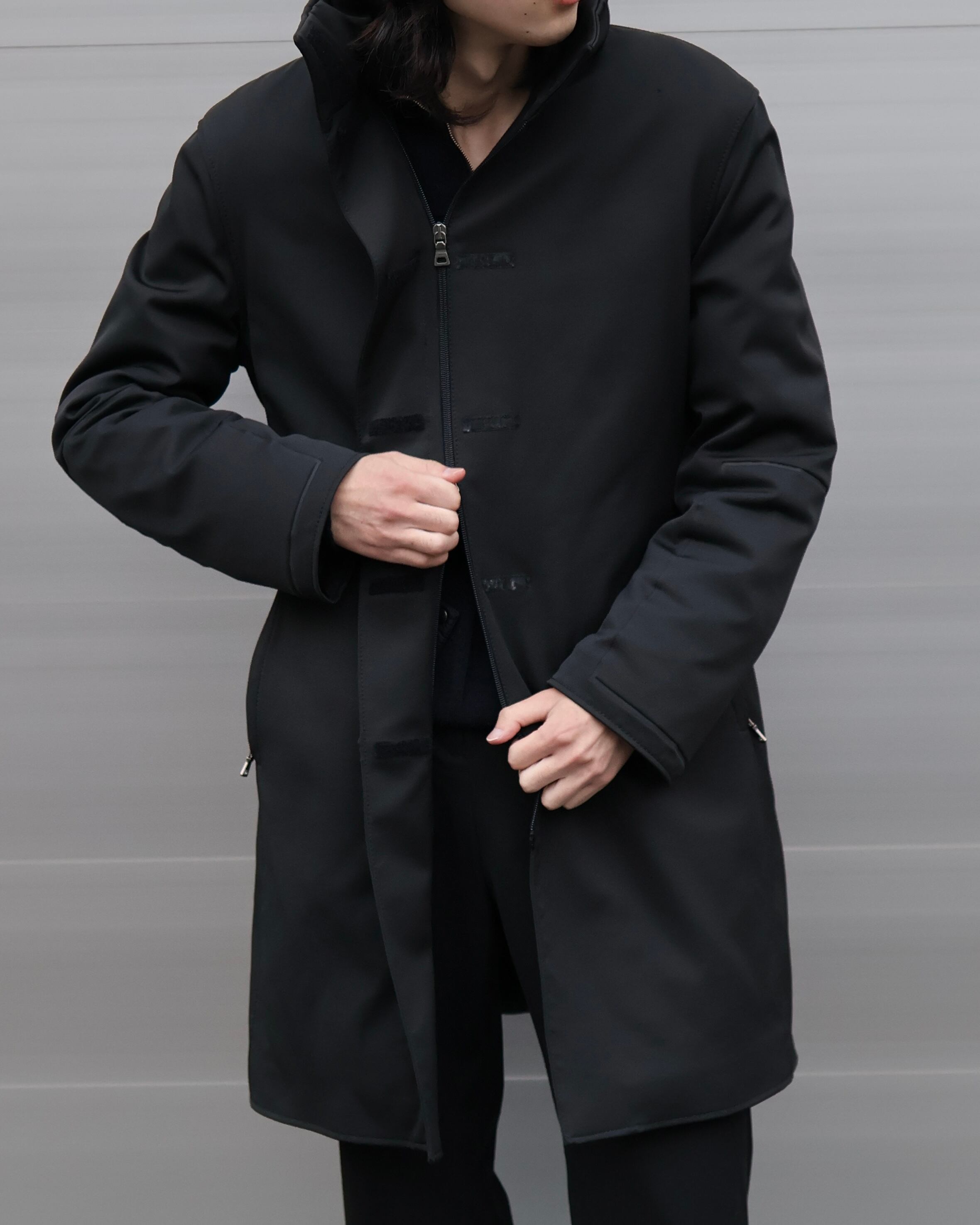 プラダらしいラグジュアリーさで、無駄な装飾がない綺麗なコート。袖部分のプラダのタグが特徴的で洗練されたディティールにより高級感溢れる1着