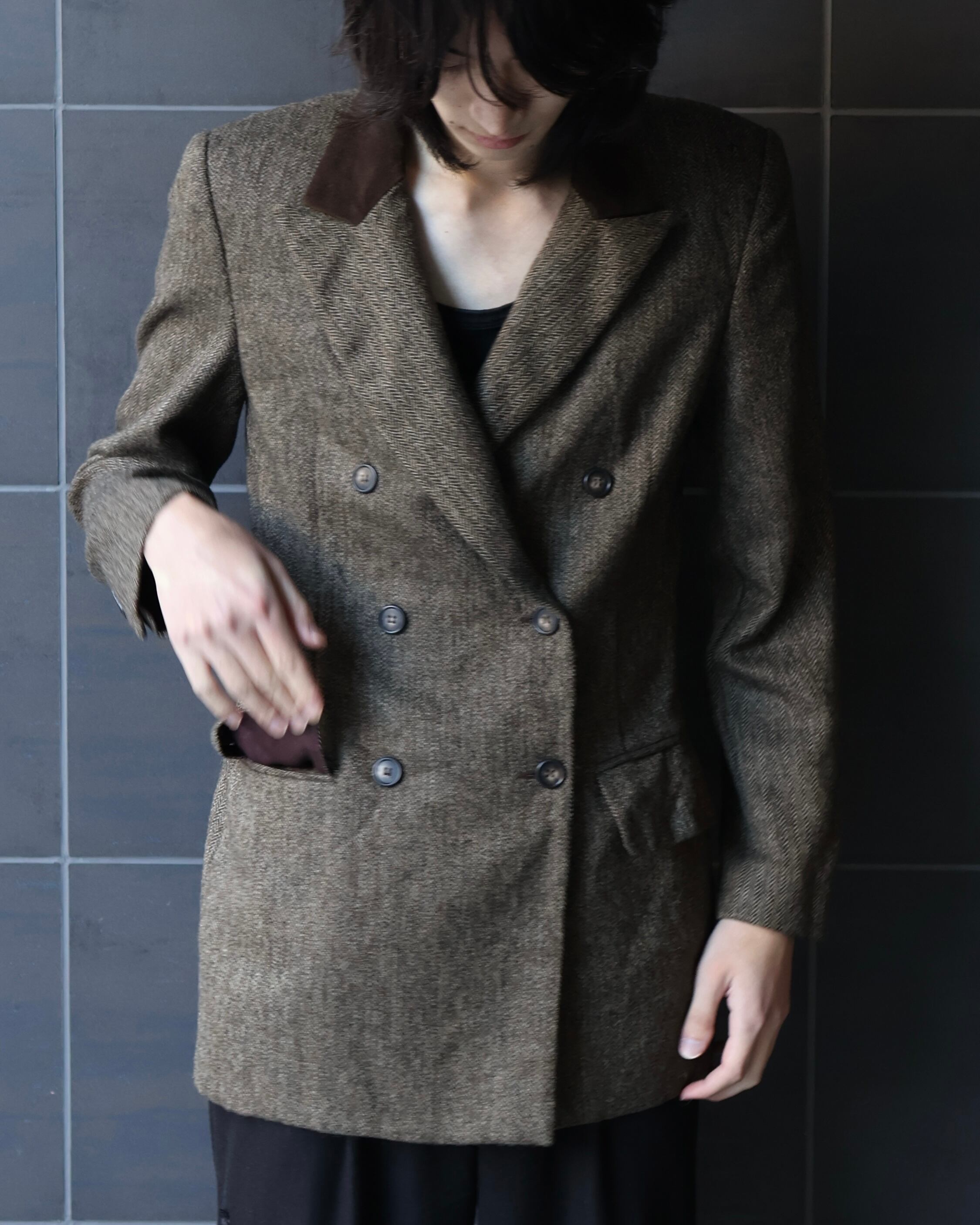 ラペルが色切り替えデザインのクラシックダブルテーラード。様々なスタイリングに使え、秋冬だけでなく春先まで活躍する持っておきたい1着。