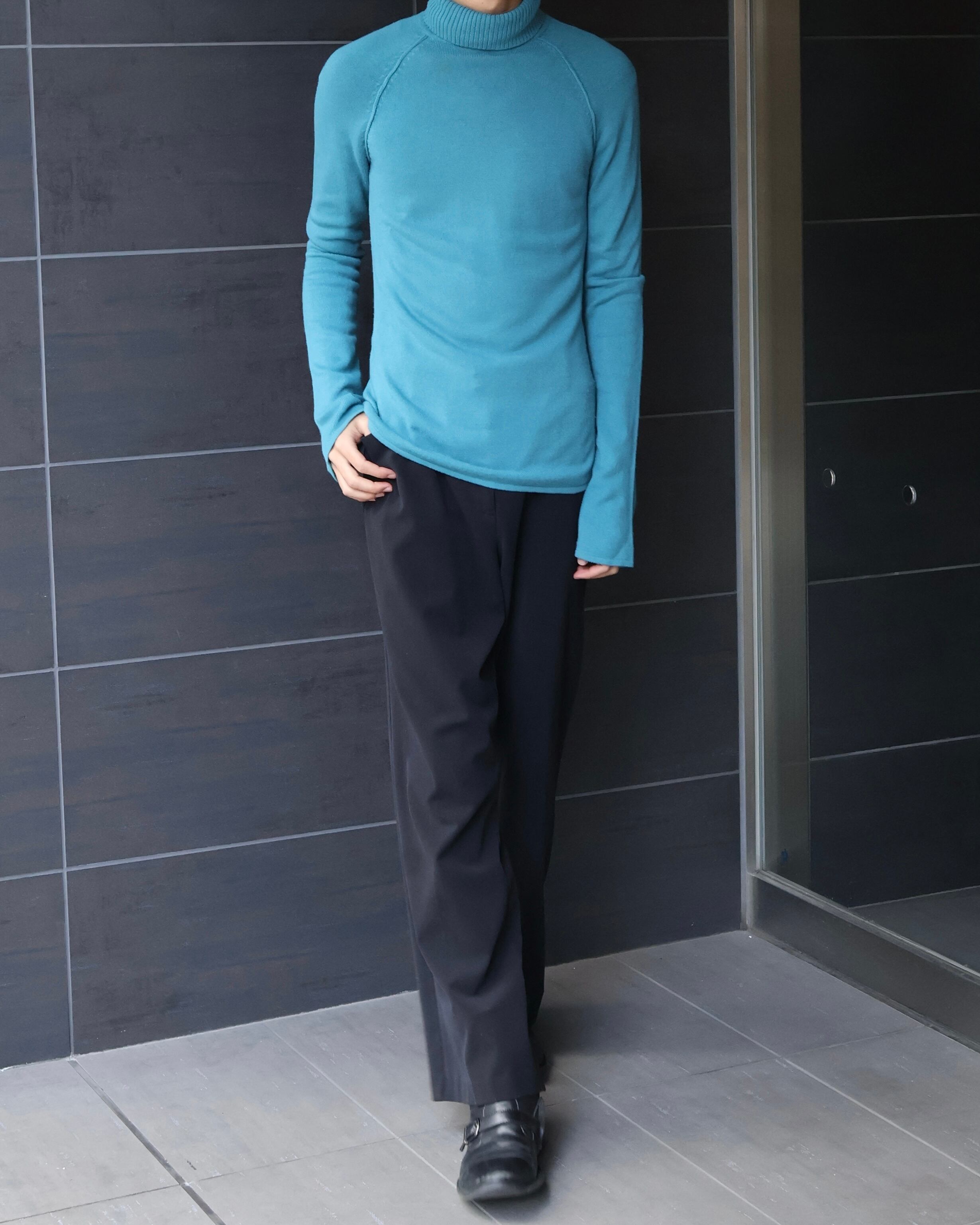 タイトなサイズ感のハイネックニット