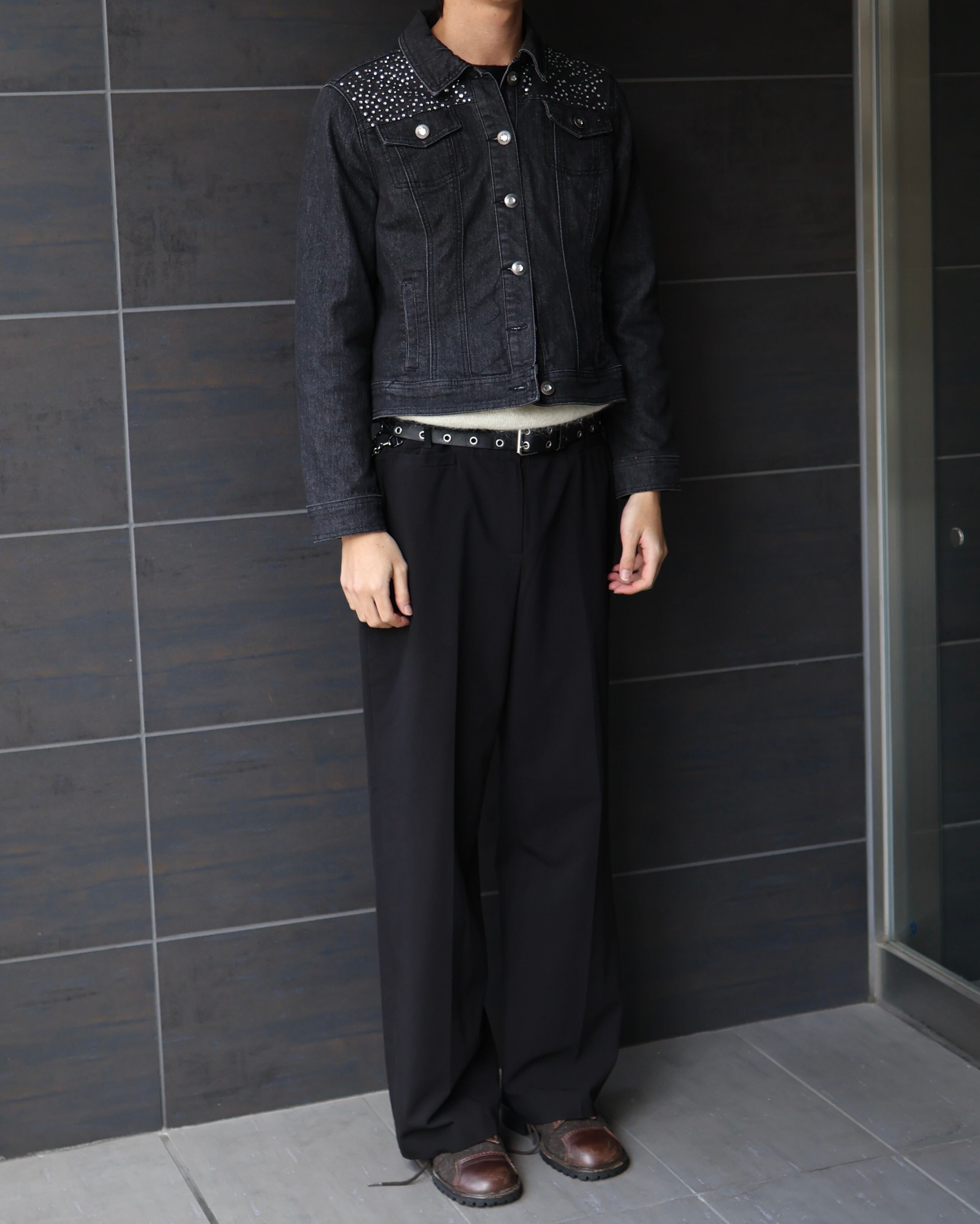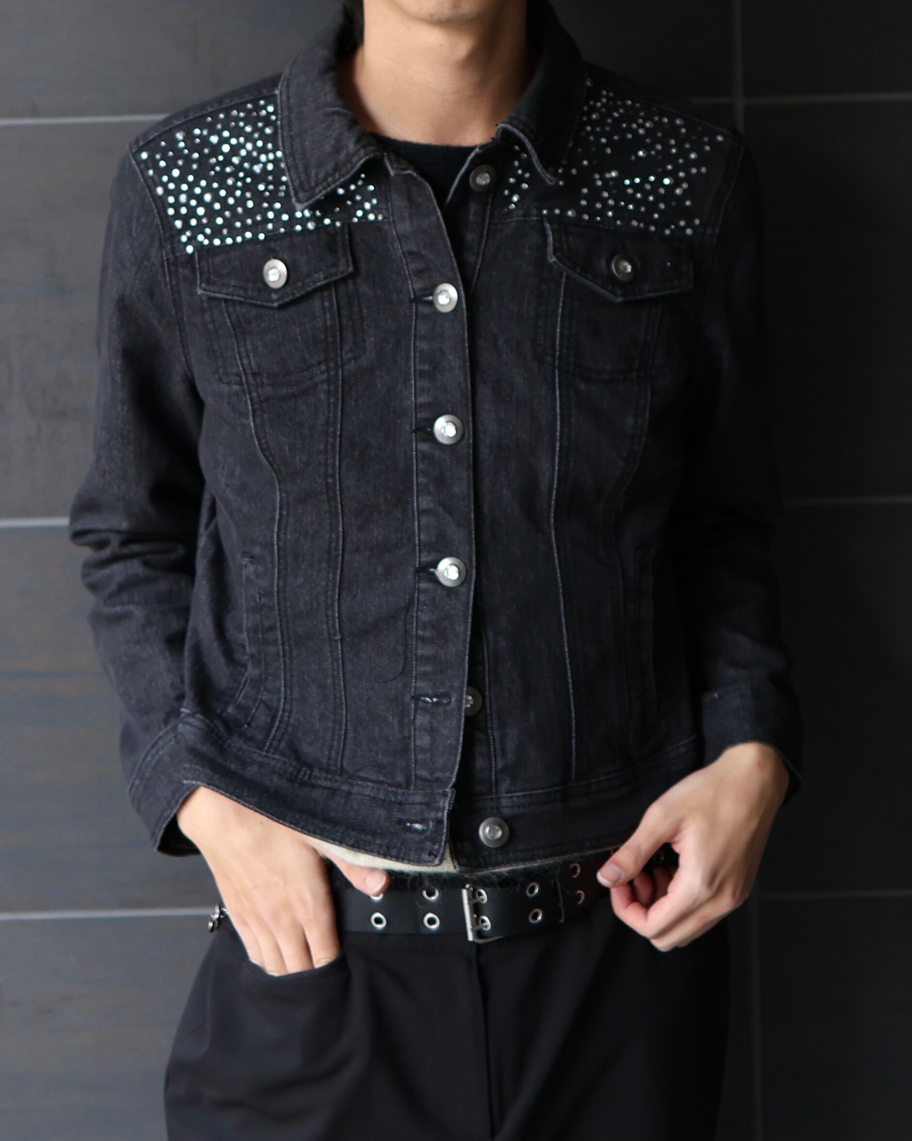 フロントのラインストーンが特徴的な短丈デニムジャケット