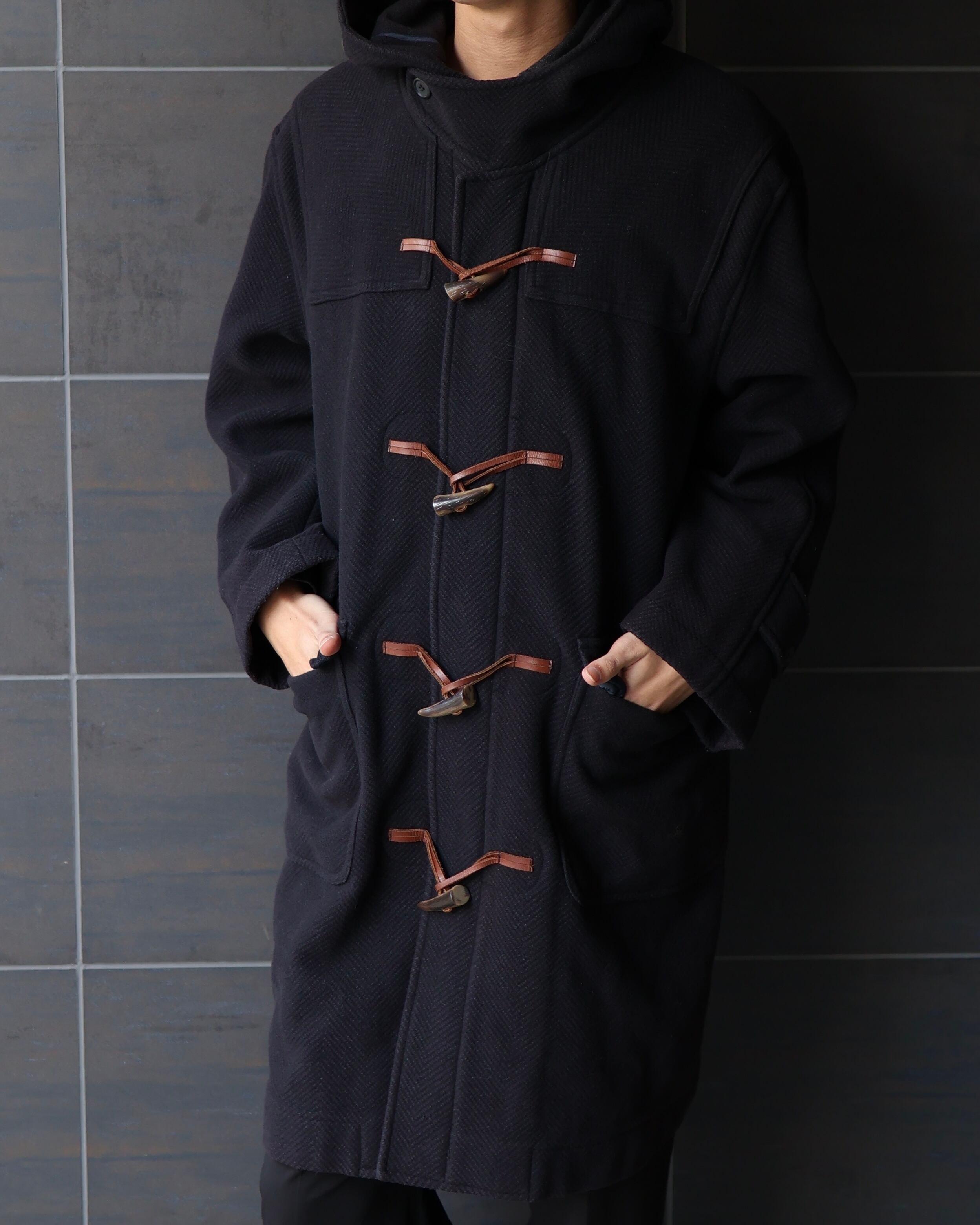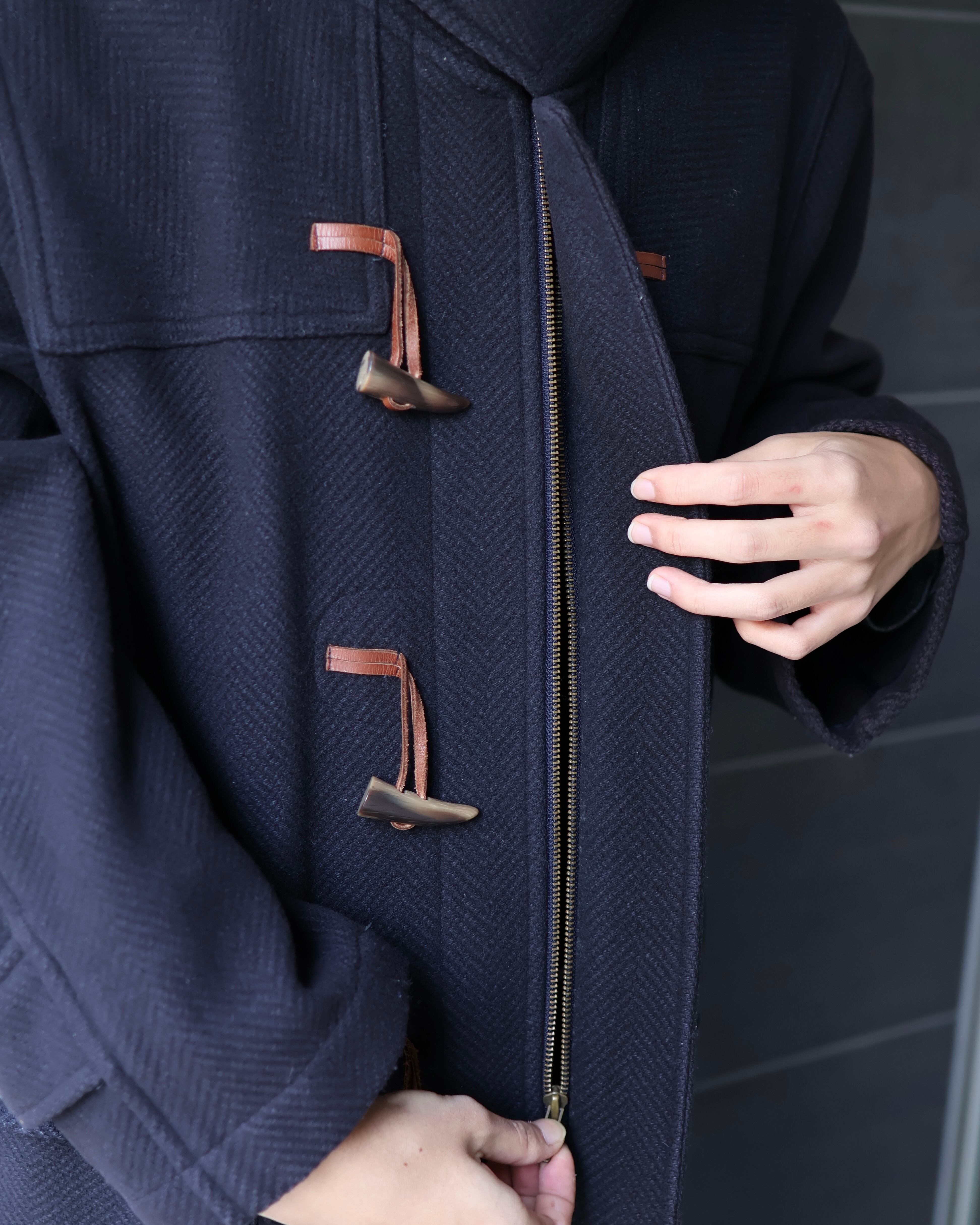 ダッフルコート特有のトグルボタンとジップの両方で開閉することが可能なアイテム。