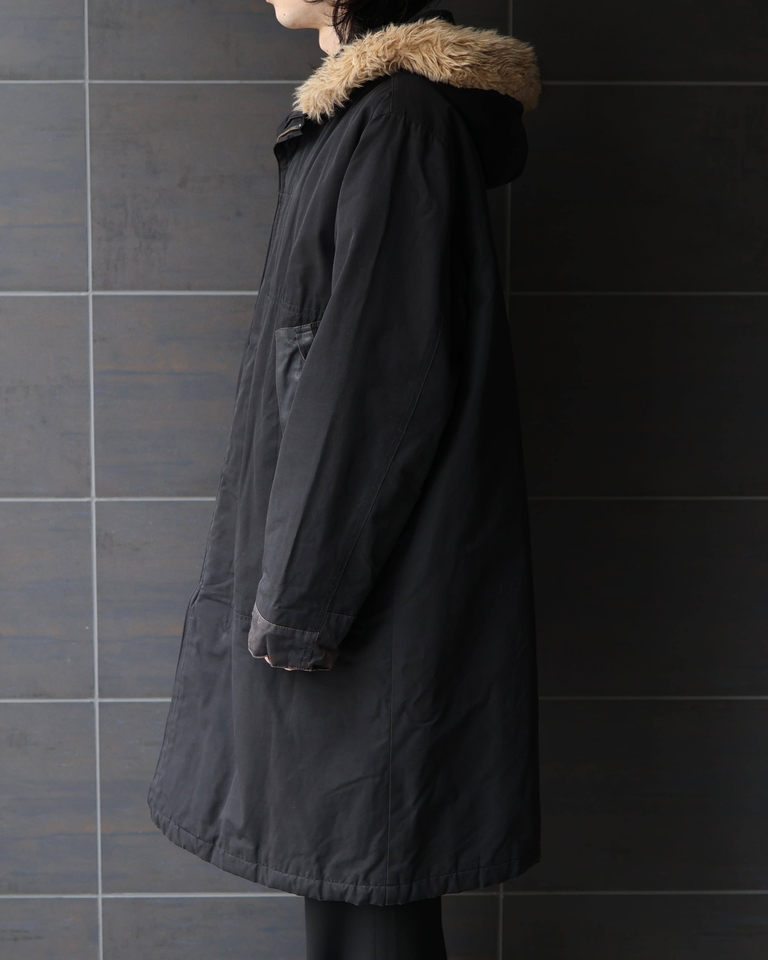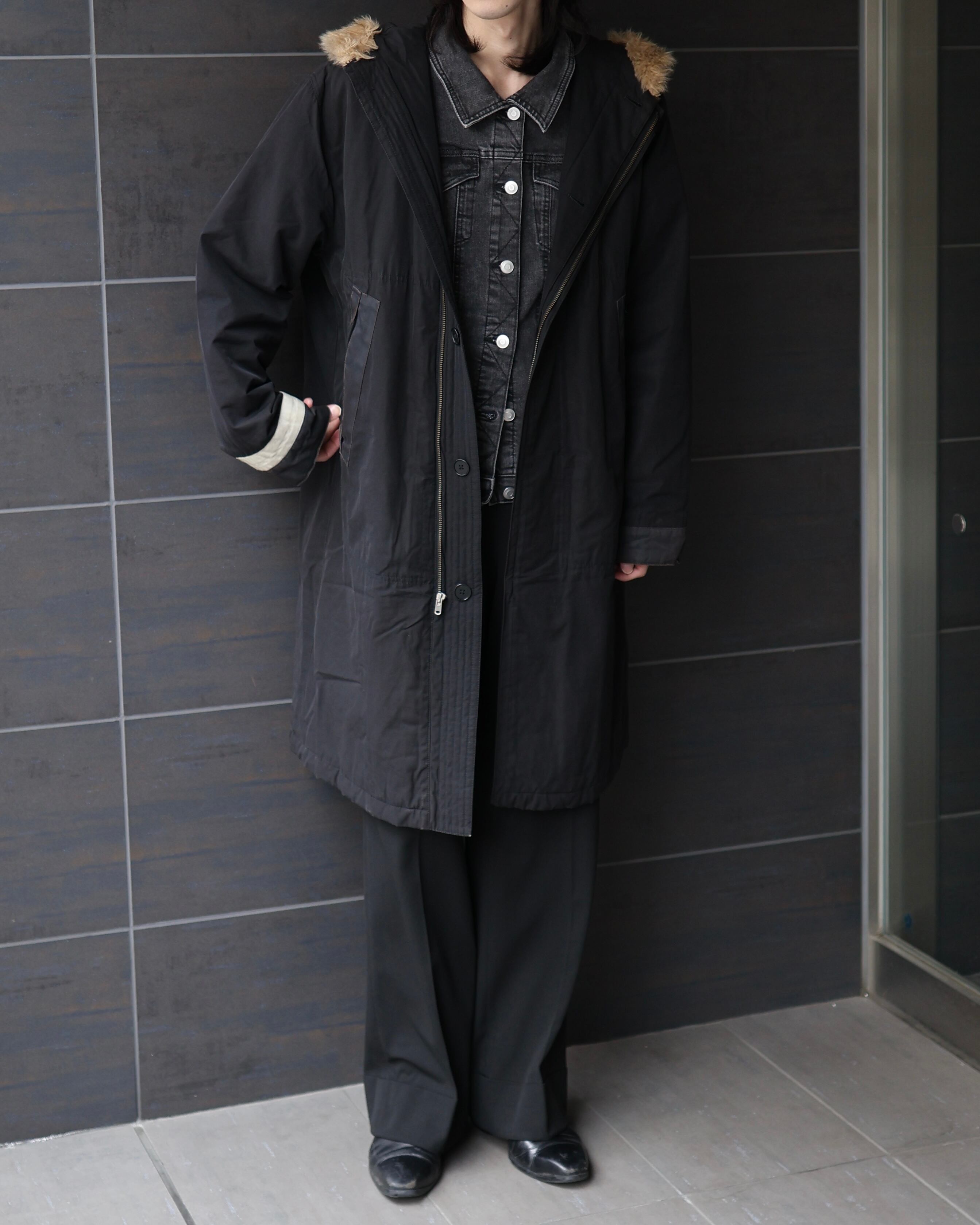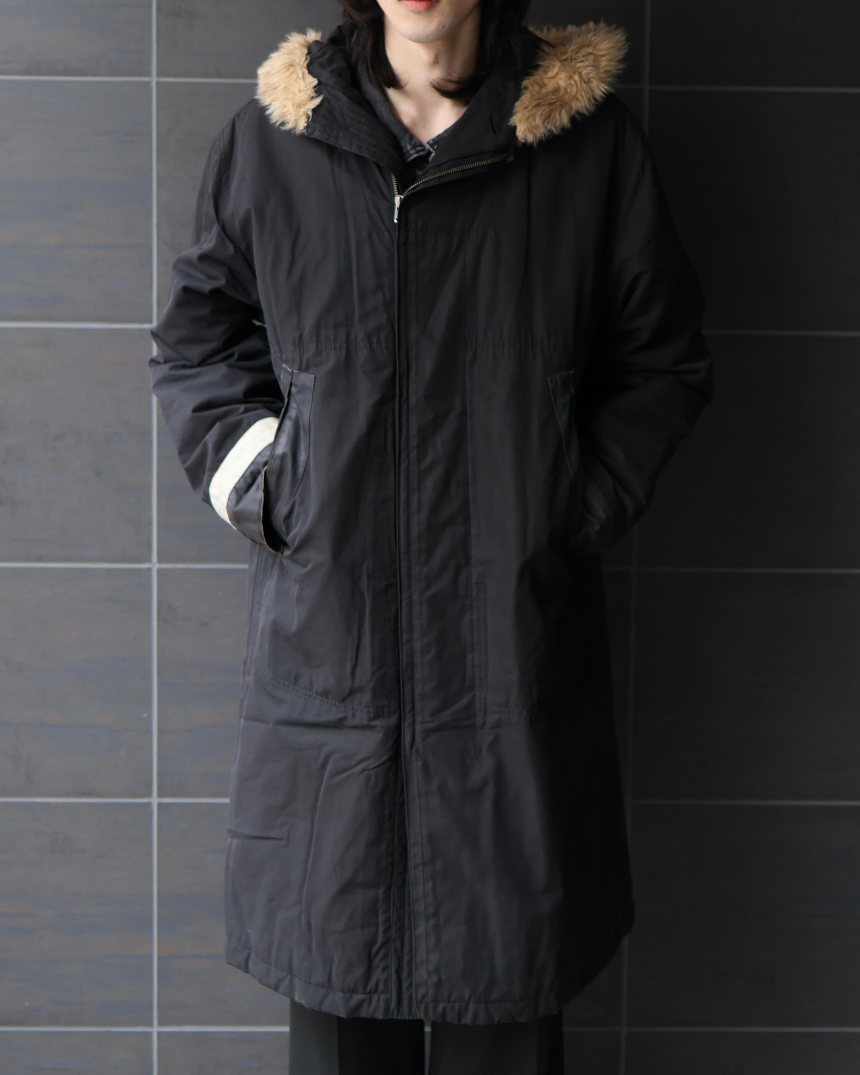 フードにファーの施されたフェード感のあるコート。サイズ感、トレンド性、素材感、フードの大きさ◎。ファーが程よいアクセントになりトレンド性のあるアウターでモノトーンなデザインがどんなスタイルにもハマりやすい万能な1着。