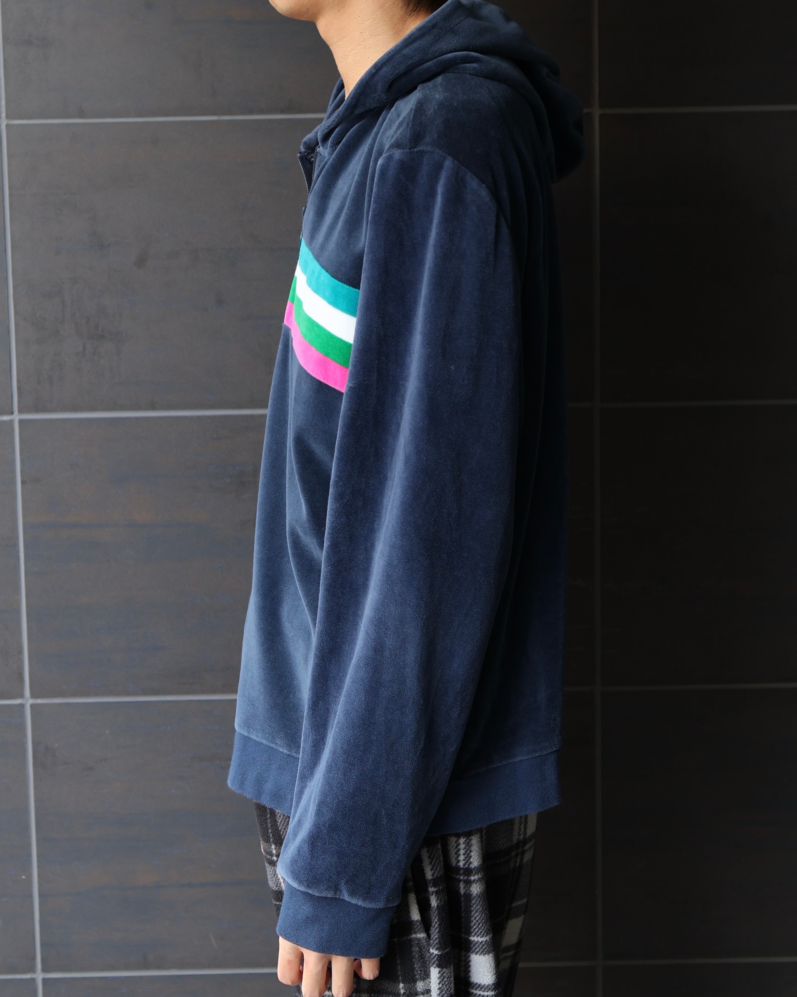 フロントのカラーリングが特徴的なベロア素材のジップフーディー。