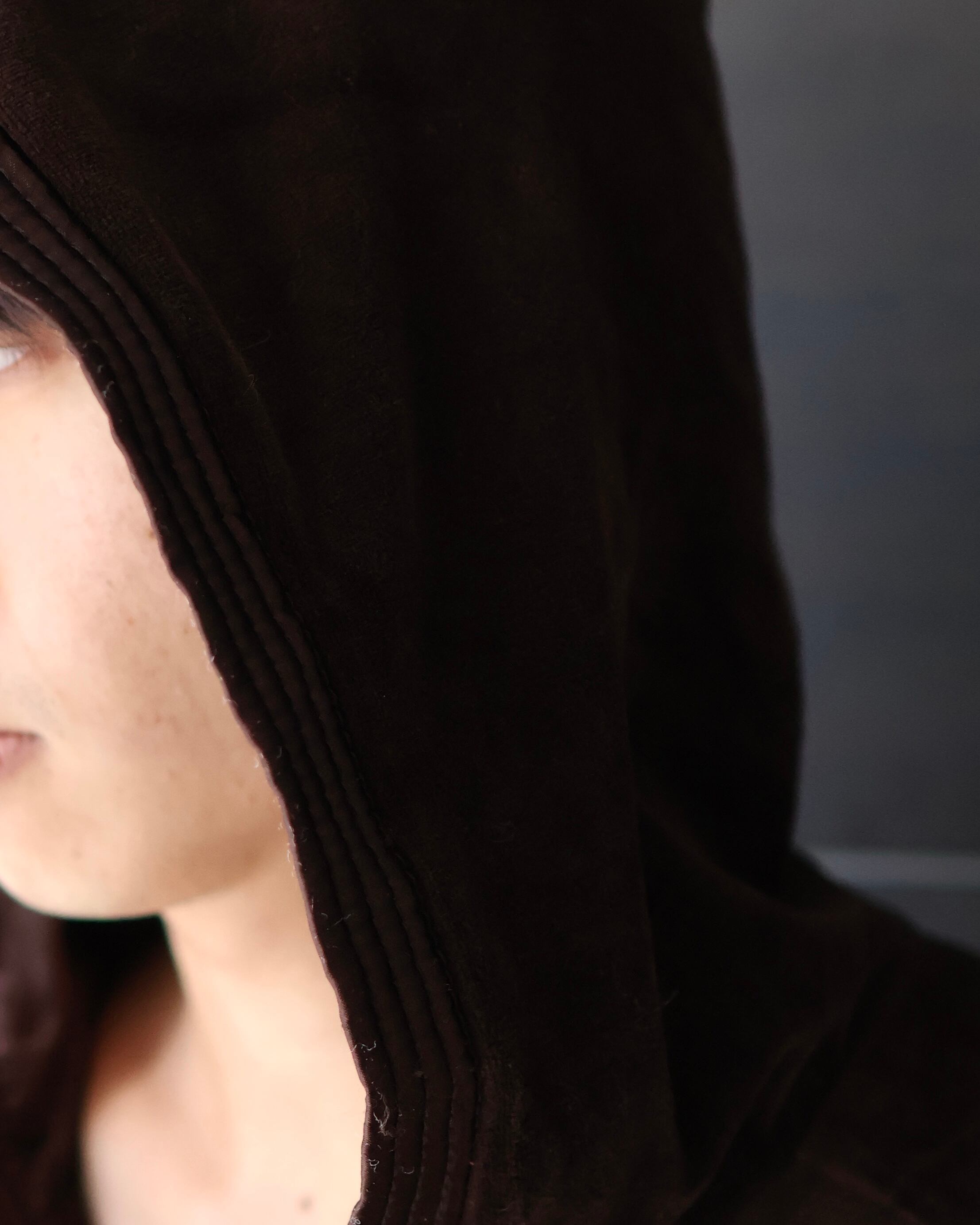 フードのディティールが凝られたベロア素材のジップアップフーディー