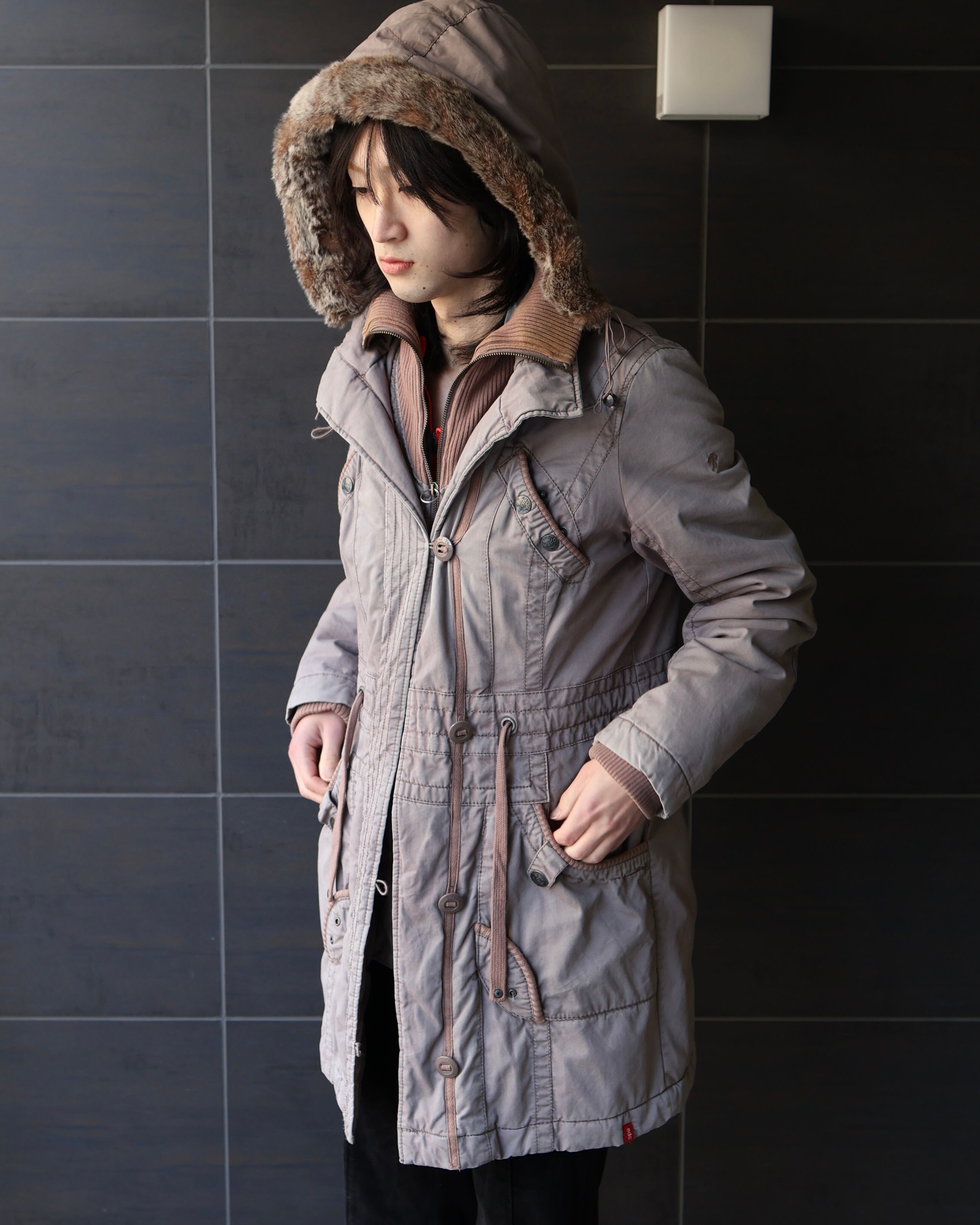 ジップ部分でレイヤードが施されているファーフーディーコート