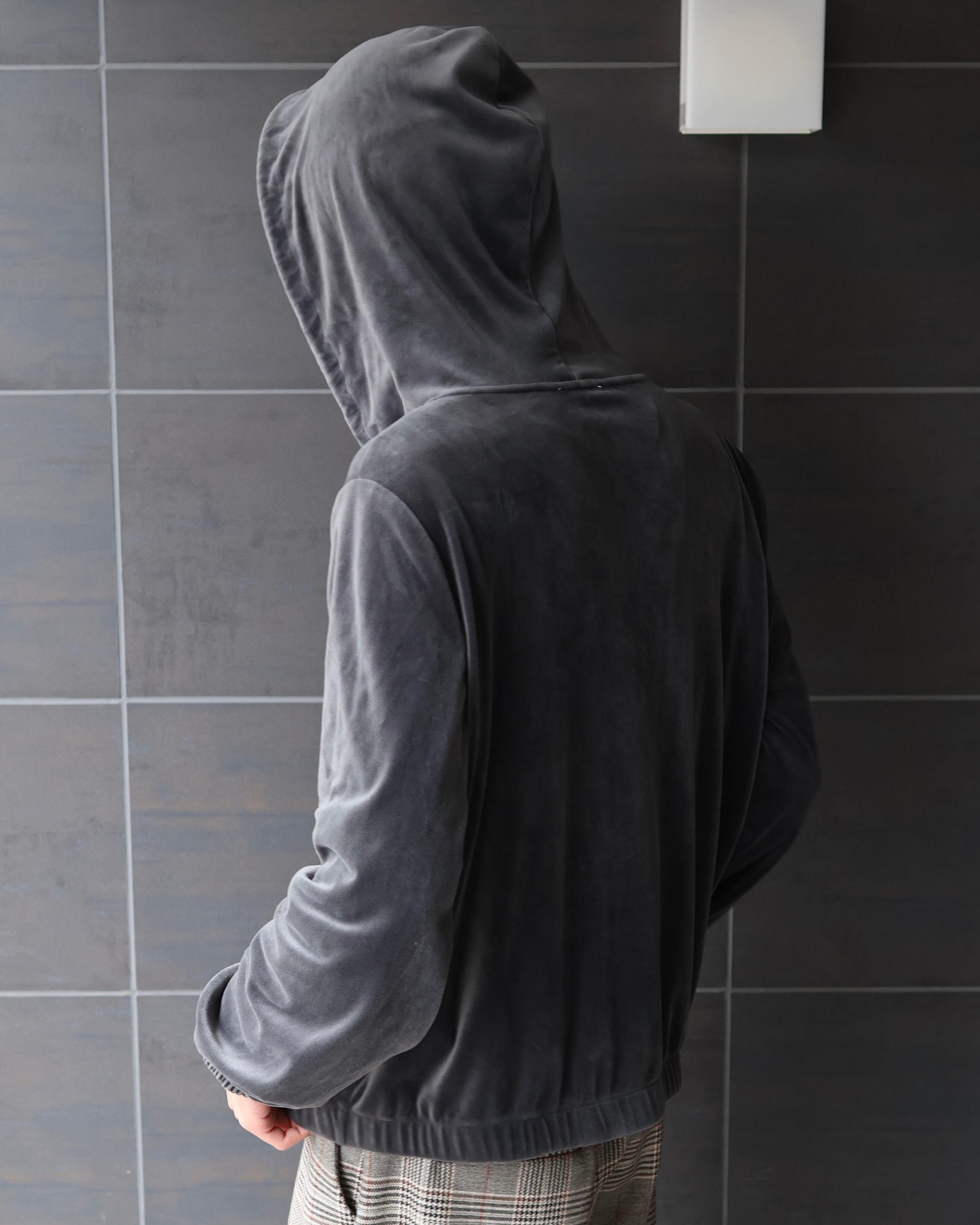 ジップ部分、フード紐の部分のラインストーンデザインが特徴的で、カラーリングがグレーのためモードなスタイリングにも落とし込むことが簡易なアイテム。
