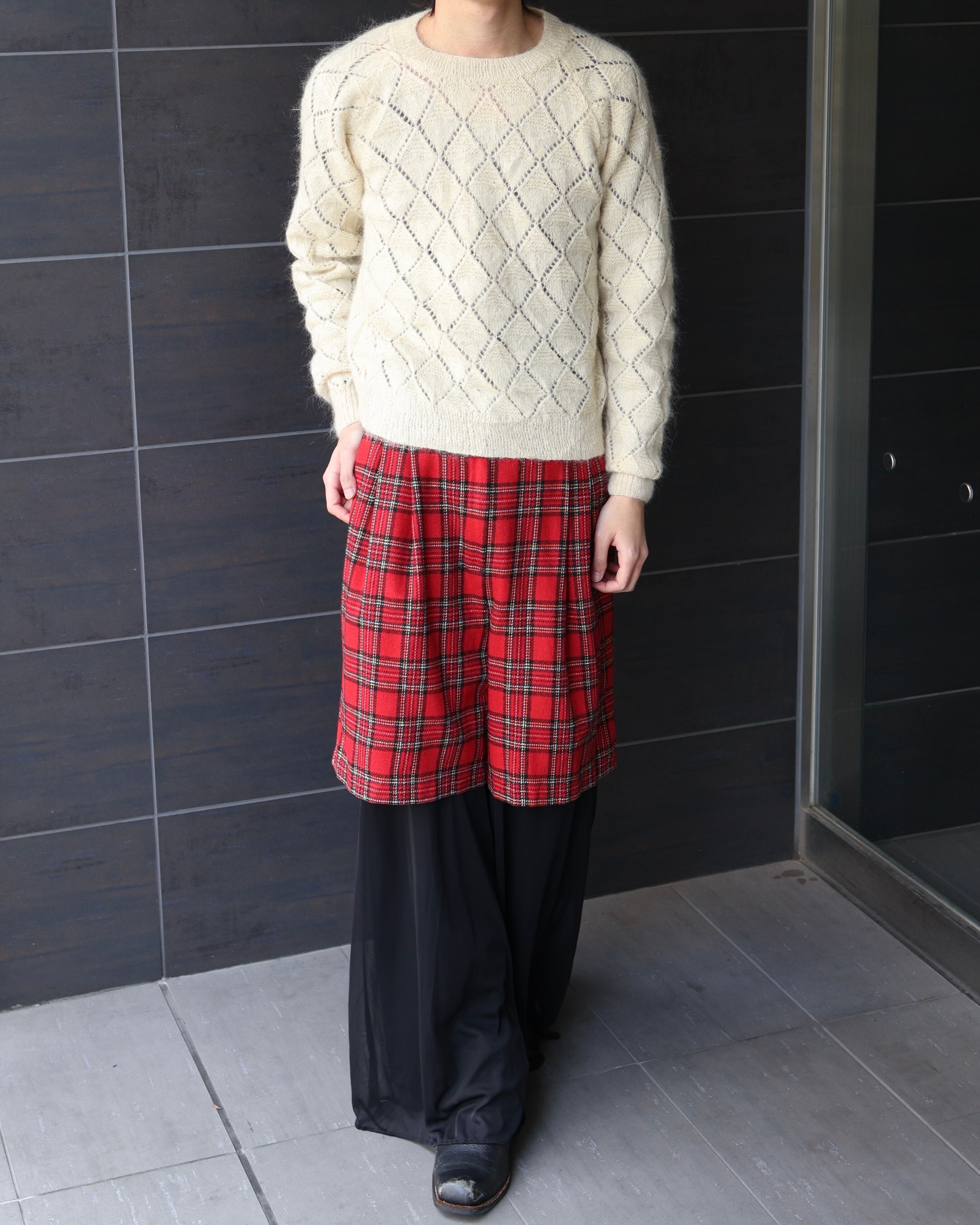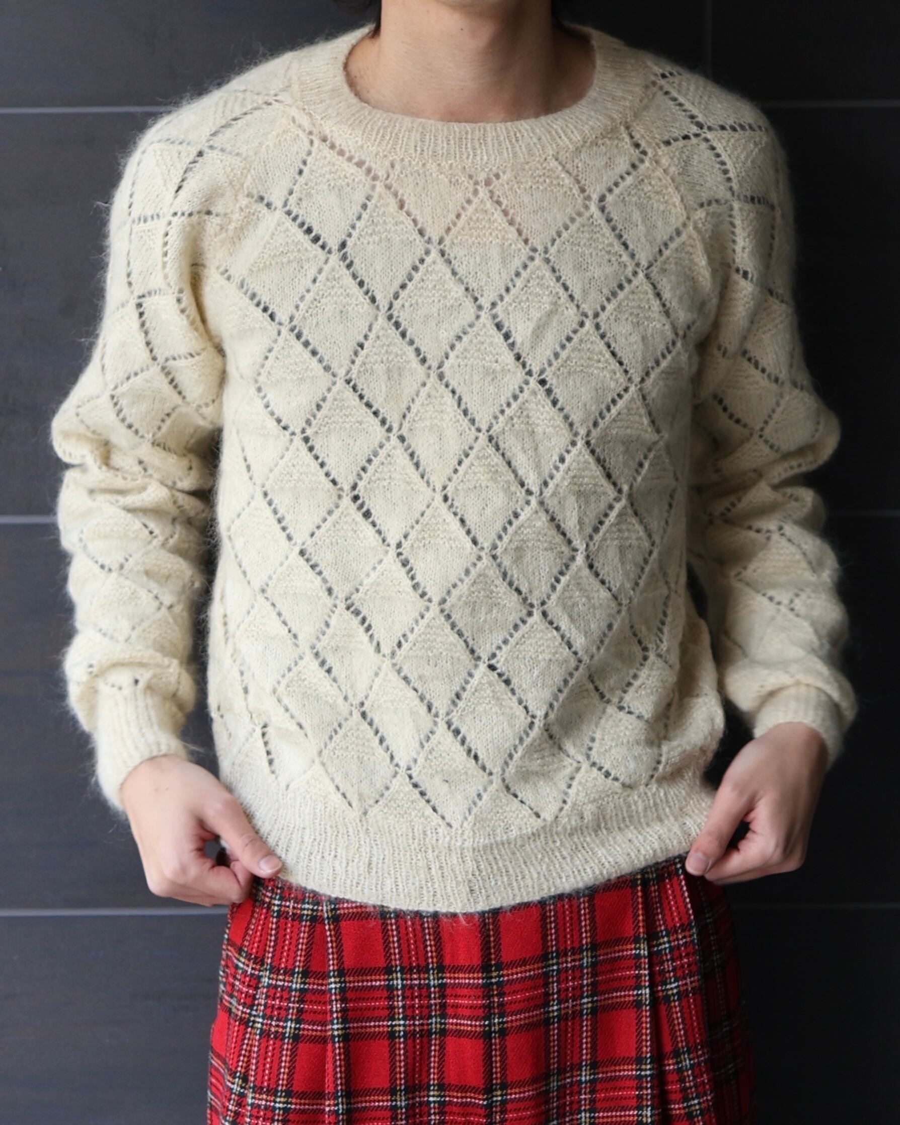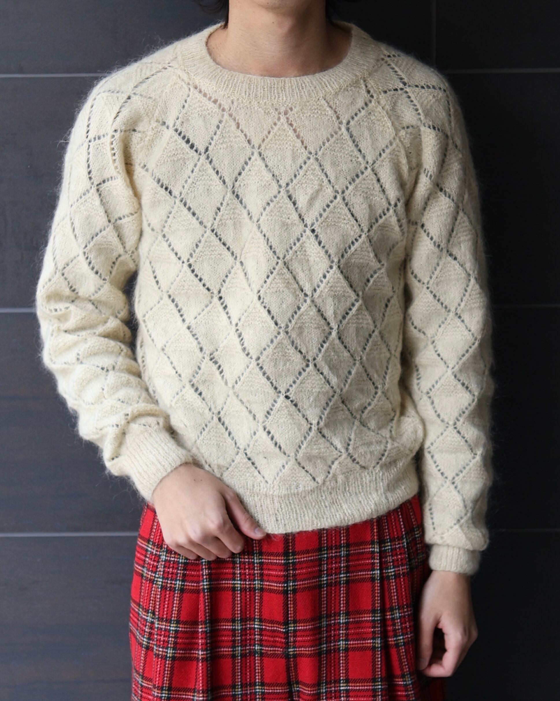 短丈のレーザーカットによって施されたようなデザインシアーニット