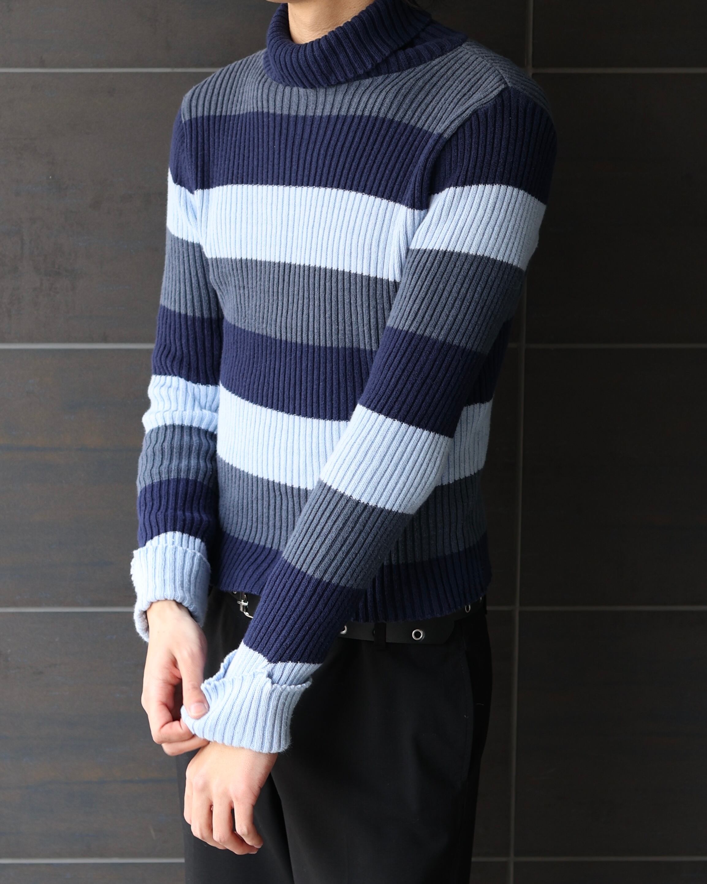 袖部分が折り曲げられているデザインのボーダータートルニット