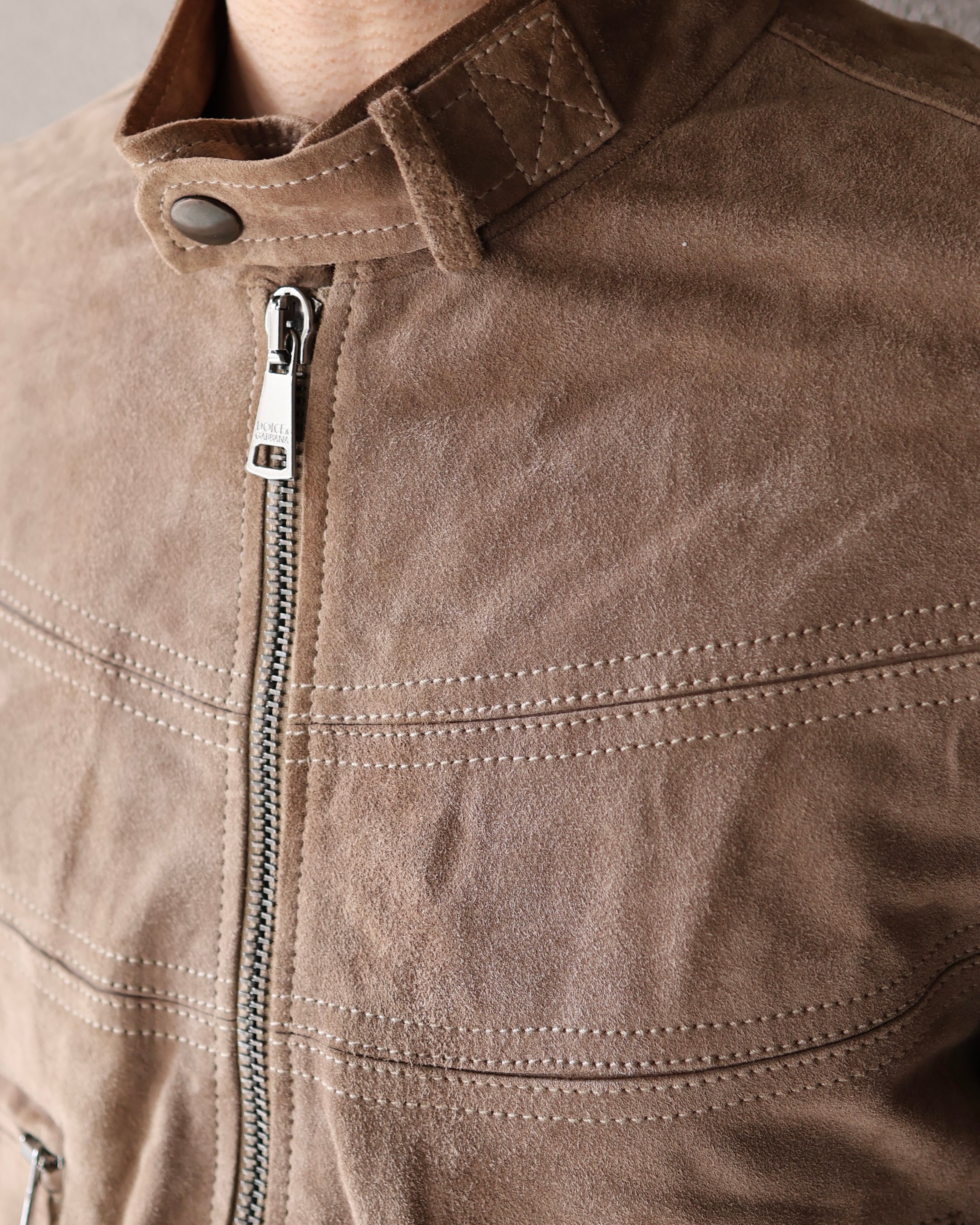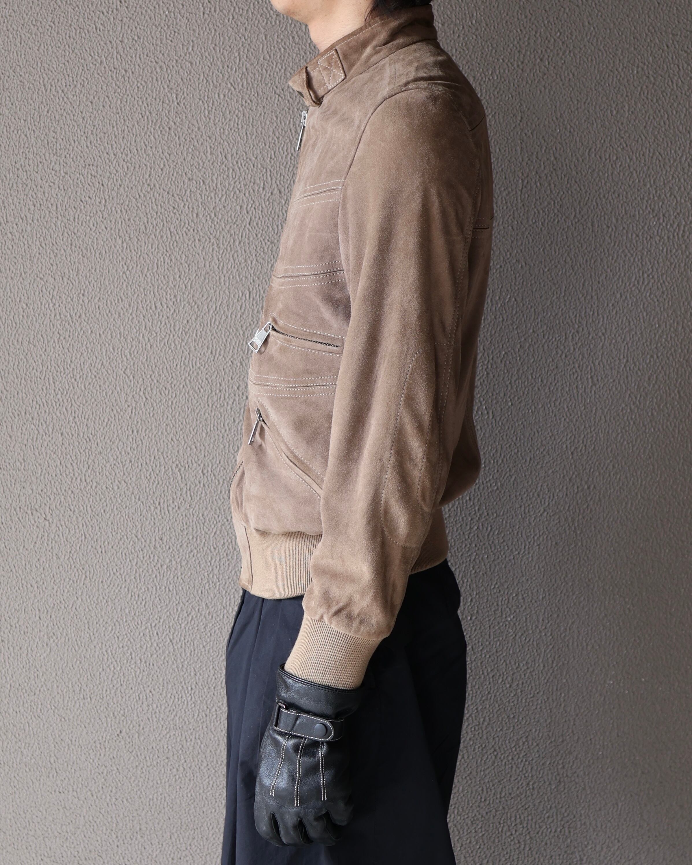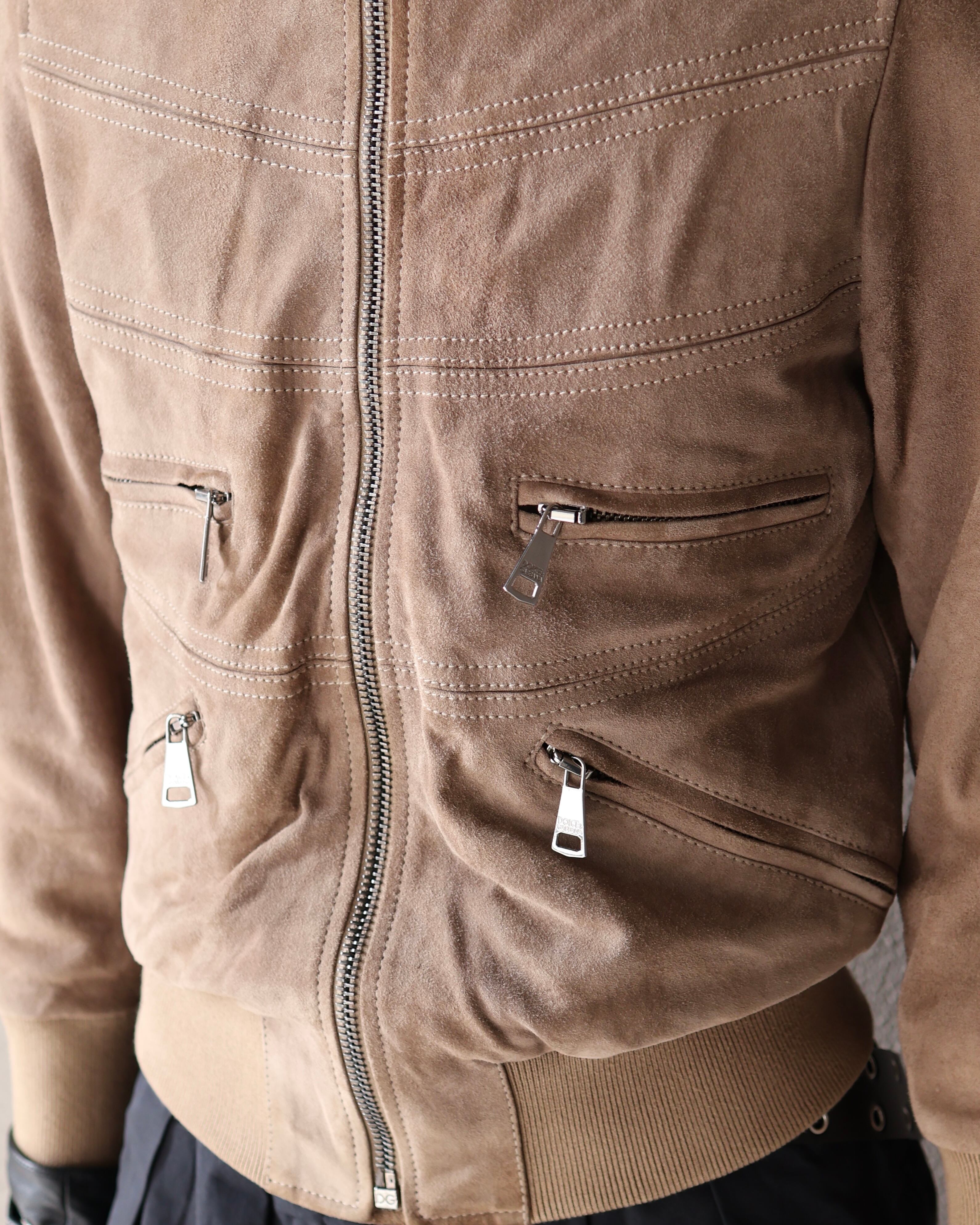 山羊のなめし革を使用した素材感により高級感のあるアイテムでディティールも凝っているデザインのため一枚で着こなすことができるアイテム。