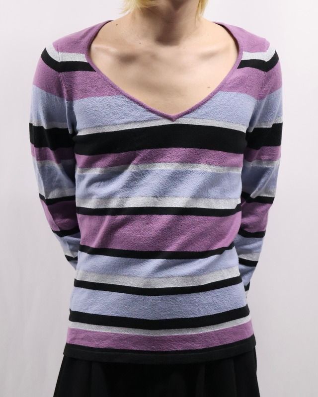 着丈 62.5 身幅 54 肩幅 72 袖丈 50 状態 B 素材 rayon 82% polyester 15% spandex 3% 着用季節 春、秋、冬 モデル 167cm 在庫状況 大阪 (商品説明) 裾のデザインが面白い、ボーダートップス。ボーダーのトップスはさまざまある中で、ヘムにさりげないデザインが施されており、コーディネートにエッジを加えてくれる、他と差別化が図れる一枚。 ※採寸は全て平置き採寸です。採寸方法などにより多少の誤差が出る事があります。 ※実際の商品になるべく近い色を再現しておりますが、お客様のご覧になっているモニターの 色の違いにより、実際の商品と色味が異なる場合がございます。予めご理解ご了承の上ご利用 下さい。 A 使用感の少ない状態良好の美品 B 細かな汚れやスレ、及び多少の使用感はあるがまだまだ使用可能な状態 C 使用感があり、目立った汚れやダメージはあるが古着に慣れていれば差し支えない状態 D 全体的に目立った使用感、ダメージがある状態